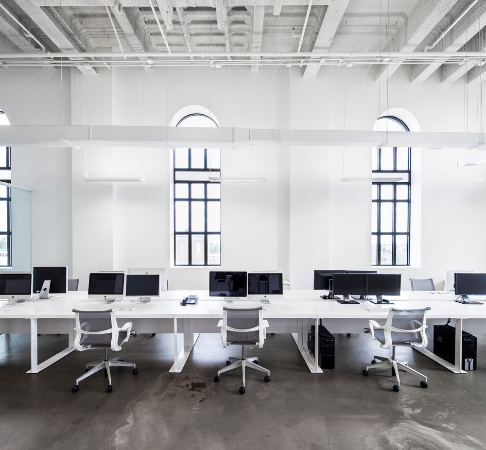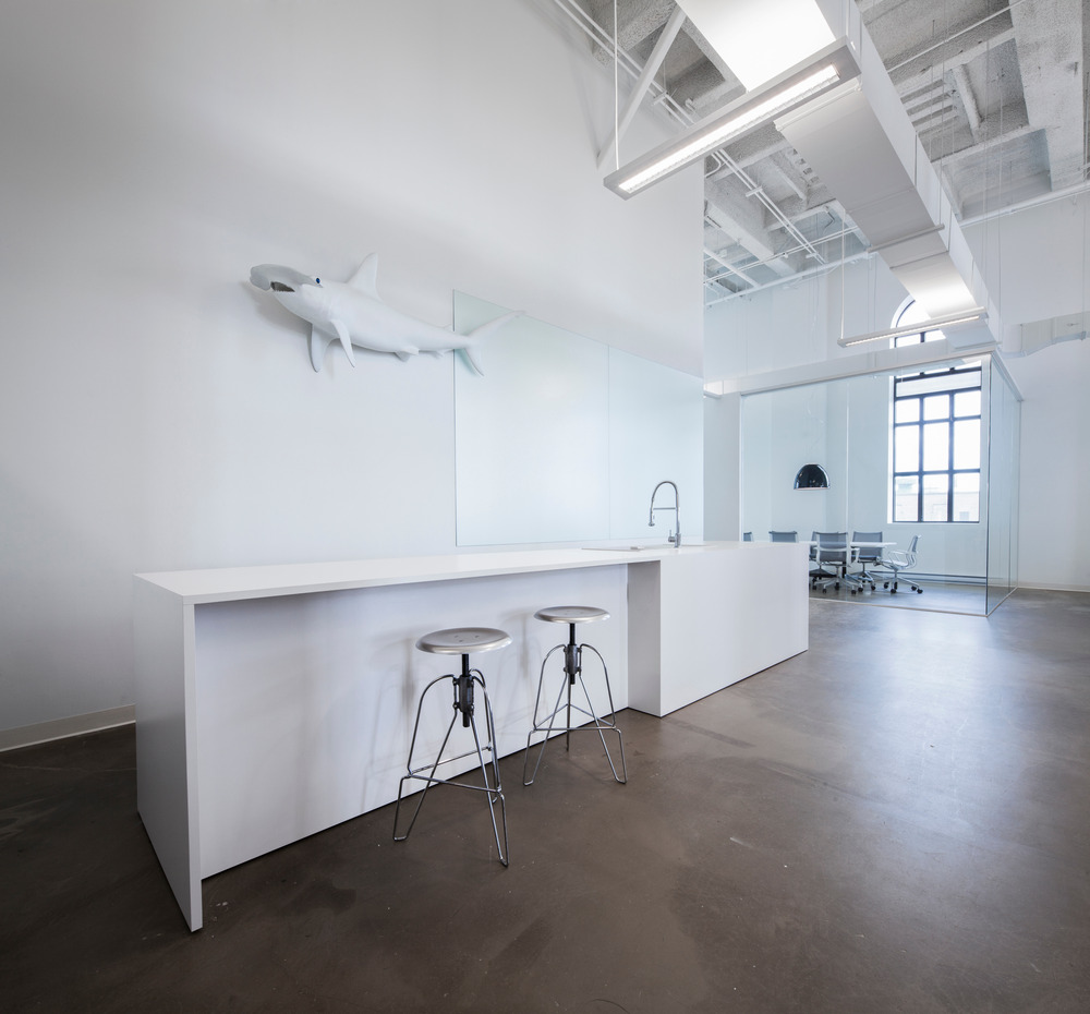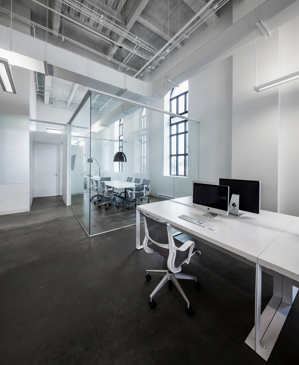 The principal concept was to wield expansive zones of living space in correspondence with the towering 30 ft. ceilings. The conference room is enveloped with high glass panels, thus allowing the box to float subtly into the space while conserving acoustic privacy. This room is the visual extension of the 36 ft. custom-designed communal table, the principal place of assembly for the office. Adjacent to this area, a row of semi-private administrative offices is divided by a rhythm of white vertical panels. The laboratory-like kitchen space is expressed as a long rectangular object set in place. Finally, the lounge is the spatial epicenter of the office, an informal congregation area where the work zones converge.