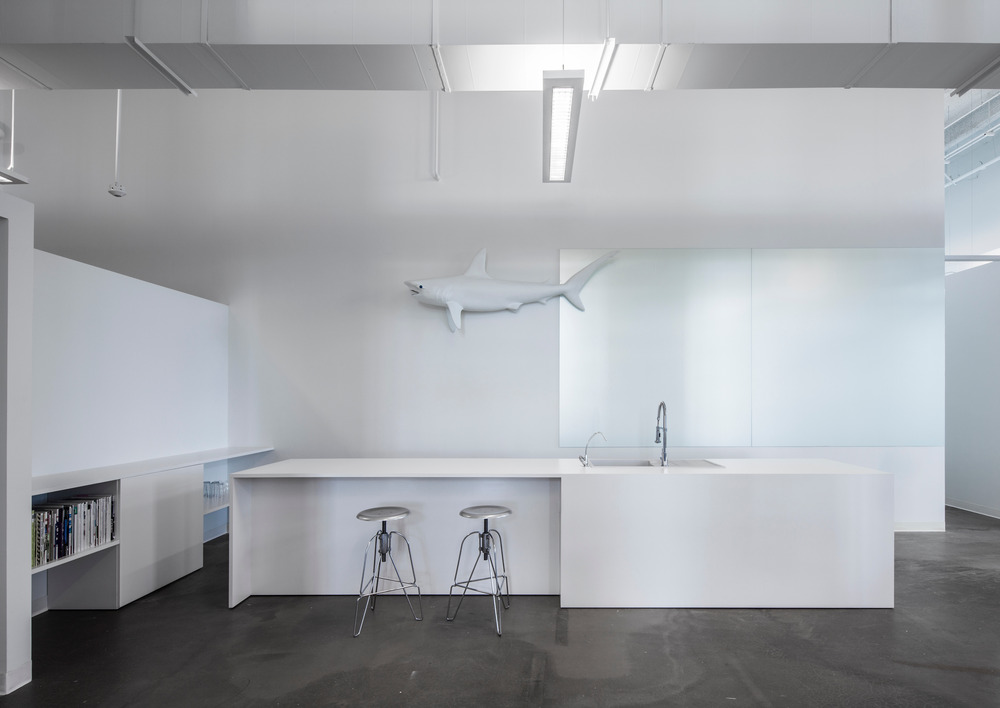 The brief was to section off different work zones to create a stimulating and creative environment, initiating interaction and communication between the respective users. The overall open concept permits all employees to enjoy the climate of each area, along with the generous natural light and panoramic views provided by the building’s tall fenestration. The user’s experience begins upon entry, where one is transitioned via a compressed space. There, the neon light from the agency’s logo leaves a virtual imprint of its identity: B L U E. On the wall, a shark mannequin gives one the impression of floating in a sea of creativity and imagination.