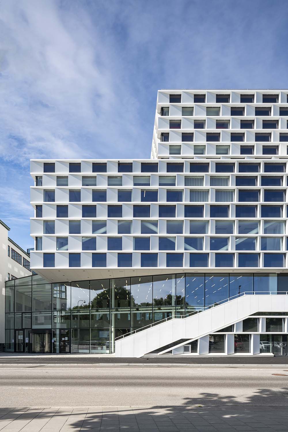 Pursuant to the conditions of the competition, the entire neighbourhood preserves its composition of various buildings of character from different eras within the 17th century grid plan worthy of preservation, including a new landmark from our time. The facades consist of curtain wall elements hung on the frame edges of the structure. A variety of angled aluminium cassettes, creating open and closed sections across the facade, allows for varied and dynamic daylight penetration. The angle and depth of the aluminium cassettes vary depending on the orientation of the facade and the underlying functions, enabling control of sunlight penetration and daylight conditions. With its homogenous, clean facades in white aluminium, a dialogue is created between the new building and the modernist architecture of the public bath. In its vibrant and agile manifestation, the facade of the new building will be a symbol for Eskilstuna as a future city of knowledge.