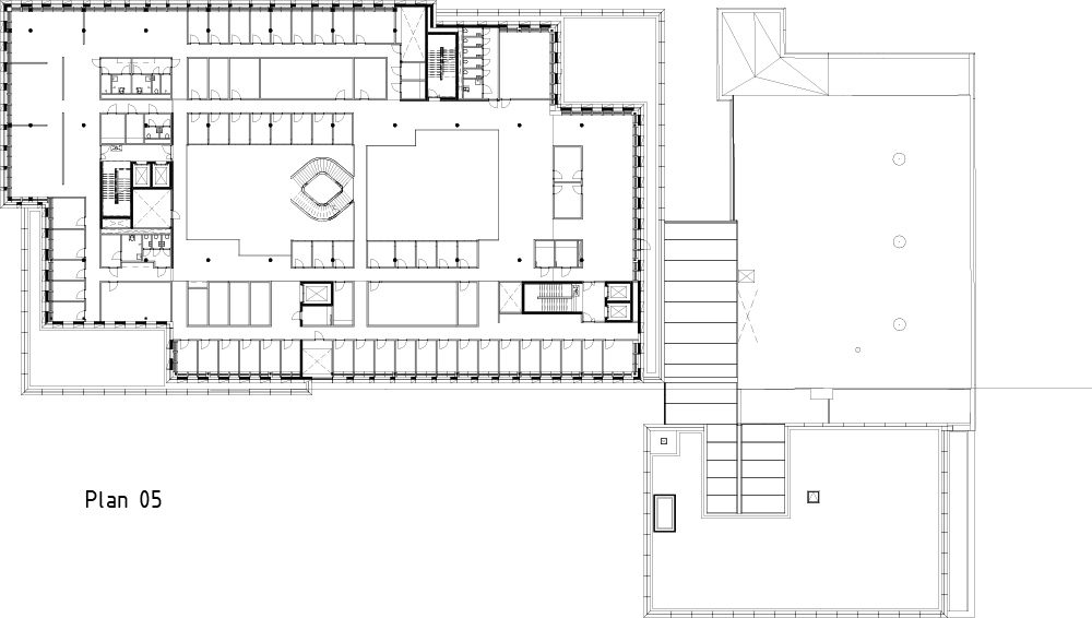 공모의 조건에 따라, 현시점의 새로운 랜드마크가 될 이 건물을 포함해 17세기의 격자 평면 내에서 전체적인 계획은 각기 다른 시대의 다양한 성격을 가진 공간이 보존되도록 계획됐다. 건물의 정면은 구조 프레임 가장자리에 매달린 커튼월로 구성된다. 다양한 각도의 알루미늄 시트는 입면 전체에 개방 및 폐쇄 구역을 생성하고, 다채로운 자연채광을 건물로 들인다. 알루미늄 파사드 유닛의 각도와 깊이는 입면의 방향과 기능에 따라 달라지므로, 자연 채광을 제어할 수 있다. 흰색 알루미늄의 균일하고 깨끗한 입면으로 새 건물과 대중목욕탕의 모더니즘 건축 사이에 대화가 이루어진다.