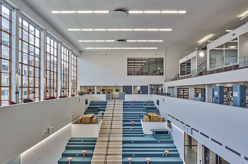 By dividing the new building into smaller units that are closely connected, total volume is reduced, providing for a natural dialogue with the original scale of the public bath. References to the functionalist architecture of the bath can be seen in the geometry and surfaces of the new building. The historic building is intertwined with the new volume into a common unit with open areas. The public bath is the heart, and all student facilities are found under one roof, including a café, library, study, and lecture halls.