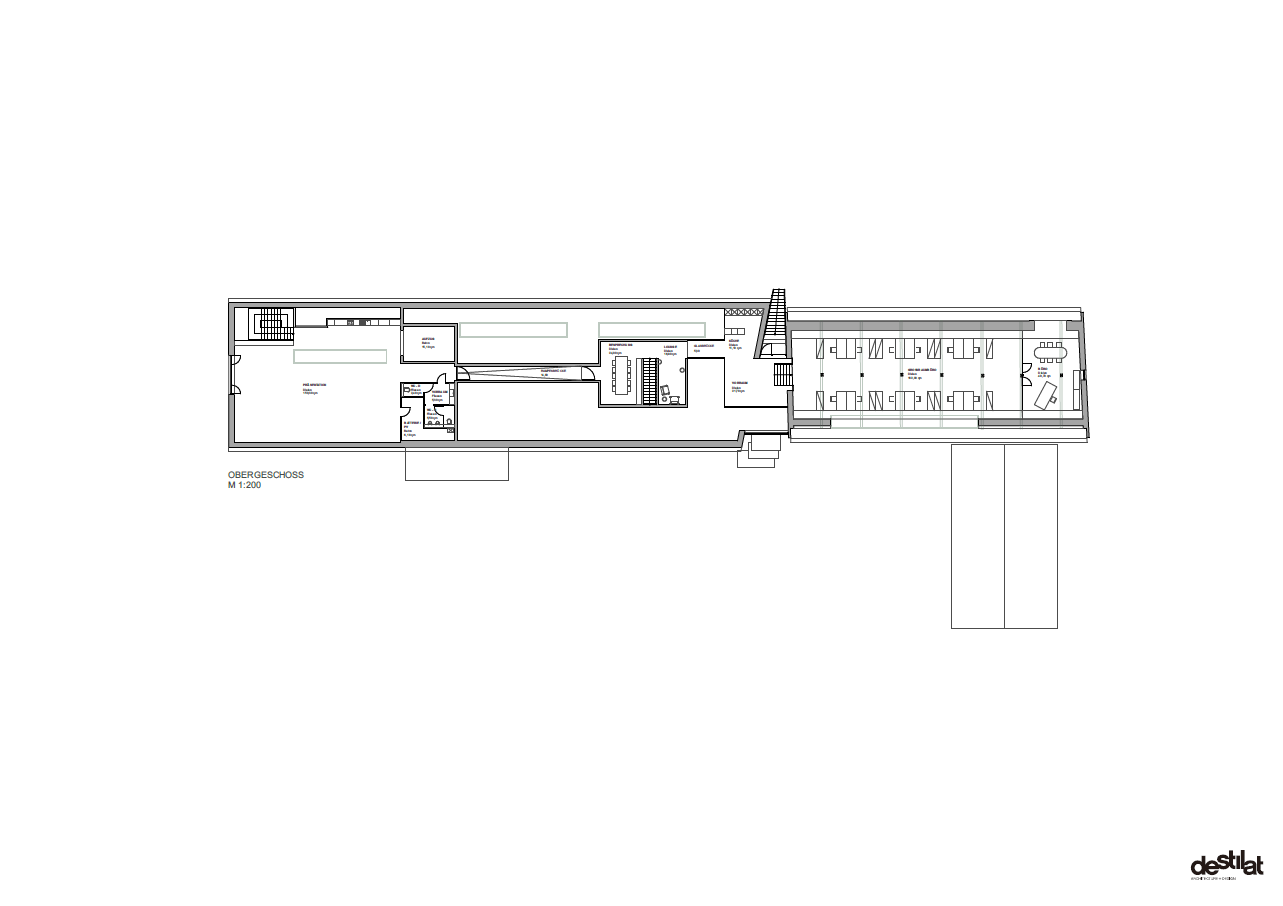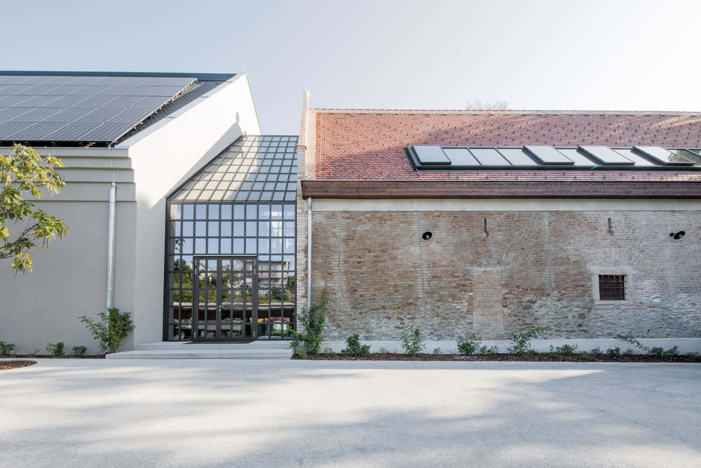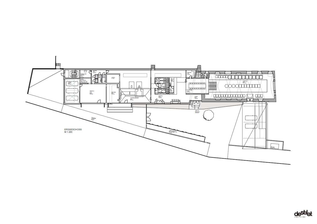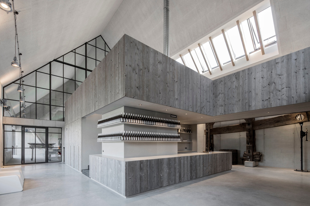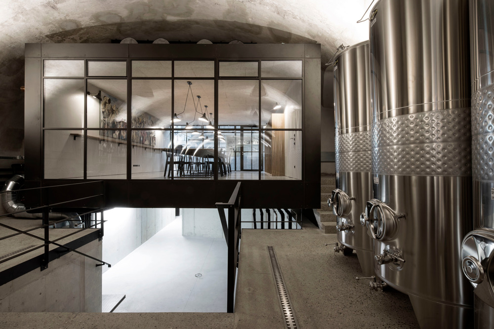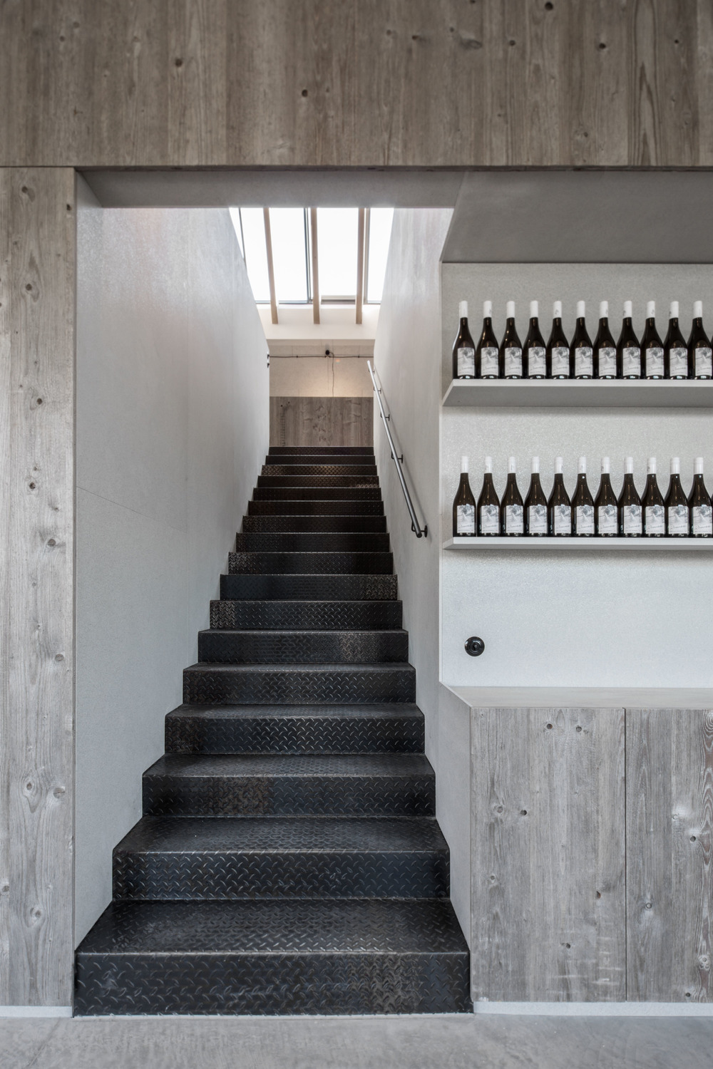 The interior design distinguishes itself with building-block-like cubes, light as a central design element, grey in all its nuances, and aesthetics that highlight the work processes involved in wine-making. A vaulted cellar, tasting room, kitchen, and office form massive spatial components that are interwoven into the structural shell, define spatial borders and take over several functions.