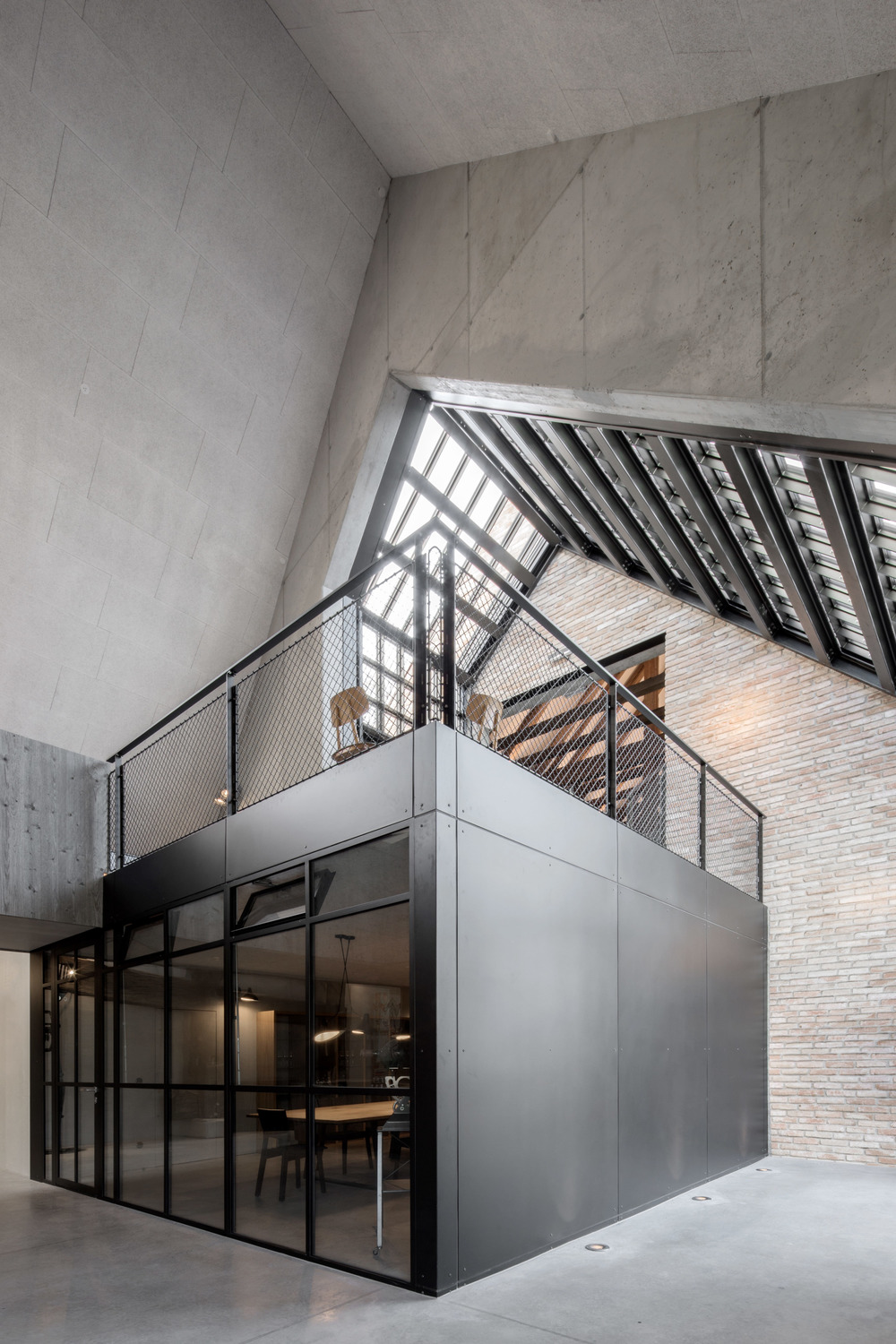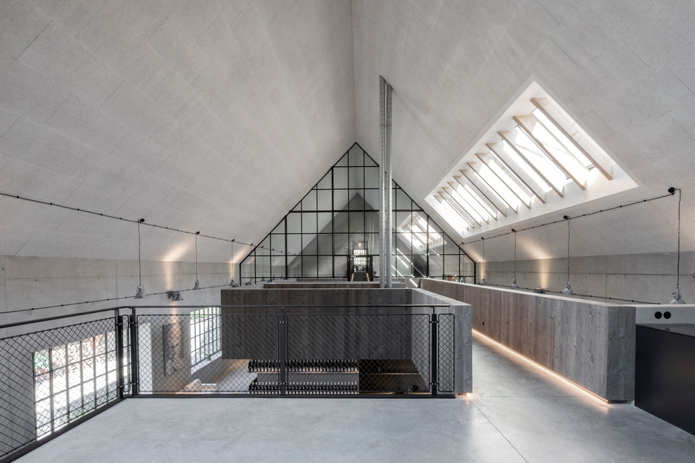 The vast open spaces between these components make them usable in many different ways and provide a big stage for light and all its effects. Exposed concrete walls, polished concrete floors, grey varnished spruce wood, anthracite-coloured Eternit, scaled steel, glass, and grey-washed brickwork – that is the combination of historic and modern materials characterizes the interior design, as its reduced colour palette brings out the fine nuances of the materials’ aesthetics.
