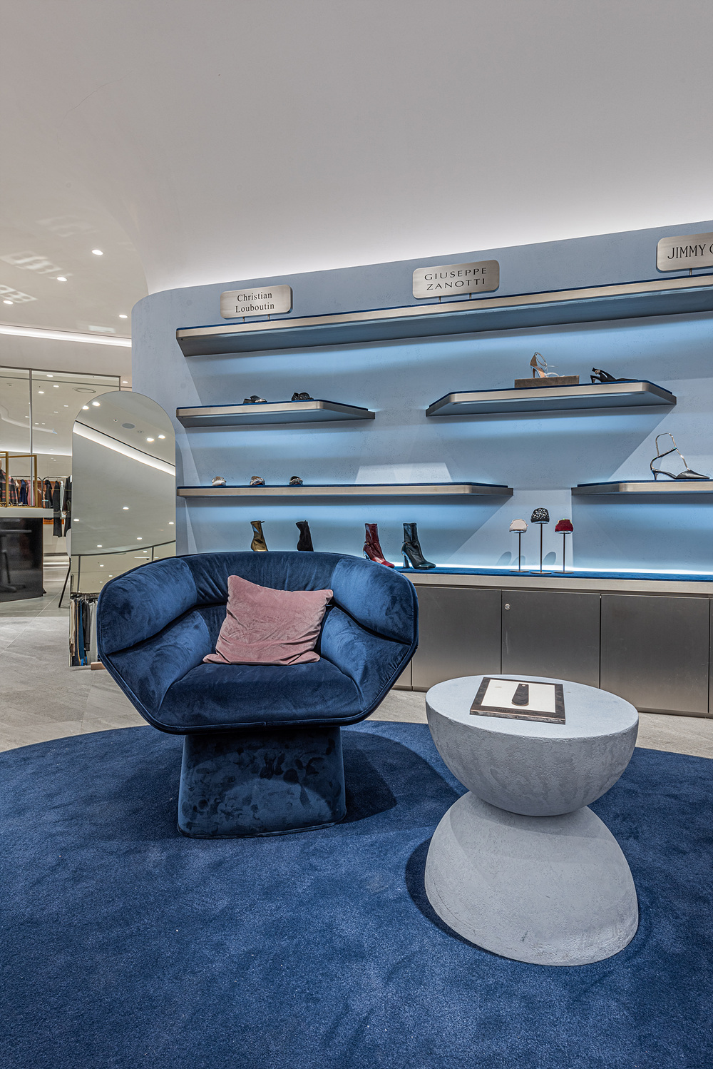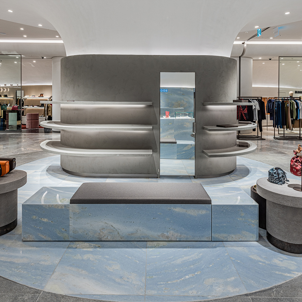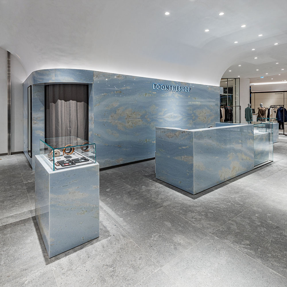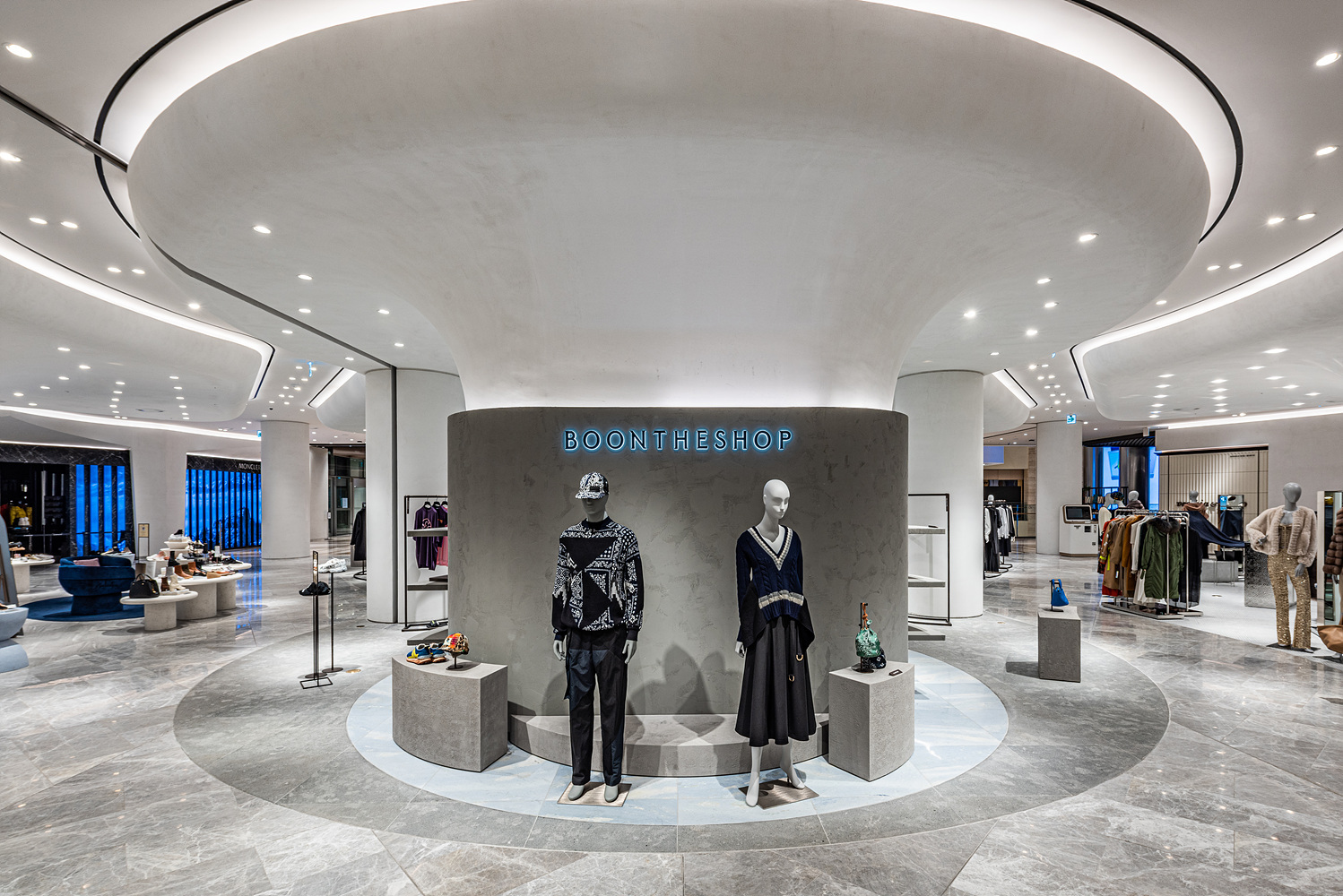 Boon the Shop is a premium select store in Shinsegae, and the image of the calm and deep sky was aimed to be brought into the interior using sky-blue marble. As it deals with various brands, we wanted to express a place with endless imagination like the sky. Furthermore, the combination of the subtle colors and materials that make the products stand out more was found by suggesting and discussing numerous finishing materials to create a unique detached mood for this brand, despite its spatial limitations of having an island-like space in a department store rather than its own independent space. The curve of the store was formed as if it were wrapped around the organic flow of customer's circulation, and sky-blue natural marble was boldly used.