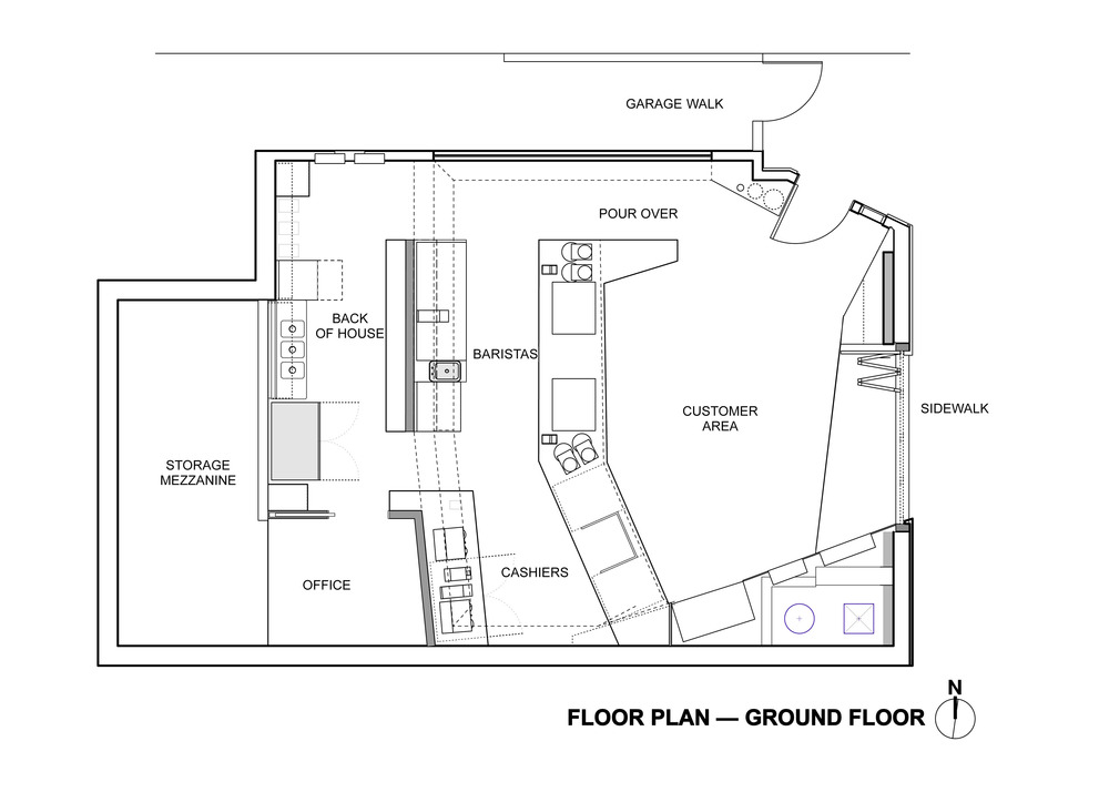 Utilizing the Japanese Shou Sugi Ban technique, the exterior wood siding is scorched, a process which inherently prolongs the life of the wood. Above the opening, the scorching fades into the wood’s natural color. On the left, at pedestrian level, the scorched wood wraps to the interior, becoming the main intervention: a black frame surrounding the baristas. This black frame becomes a room within a room, emphasizing the artistry of the barista through a minimal use of materials and high efficiency lighting. The blackened steel counter provides a stark backdrop for the finished product, and will patina over time.