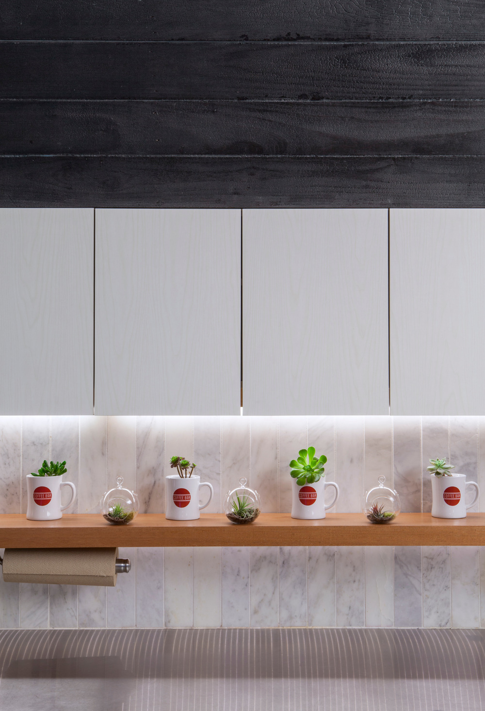 일본의 전통적인 목재 보존 방법인 Shou Sugi Ban 기술을 사용하여 목재의 외부 측멱을 그을리는 과정을 통해 목재의 수명을 연장한다. 개구부 위의 그을린 나무의 색상으로 자연스러워진다. 왼쪽의 보행자 동선에서는 그을린 나무가 내부를 감싸고 있어 바리스타를 둘러싼 검은색 프레임이 주요 개입이 된다. 이 블랙 프레임은 방 안의 방이 되어 최소한의 재료 사용과 고효율 조명을 통해 바리스타의 예술성을 강조한다. 검게 칠해진 강철 카운터는 완성된 제품의 완벽한 배경을 제공하며 시간이 지남에 따라 녹청색이 된다.