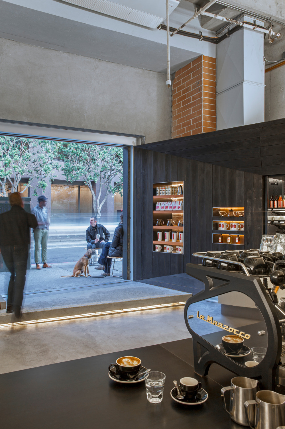 일본의 전통적인 목재 보존 방법인 Shou Sugi Ban 기술을 사용하여 목재의 외부 측멱을 그을리는 과정을 통해 목재의 수명을 연장한다. 개구부 위의 그을린 나무의 색상으로 자연스러워진다. 왼쪽의 보행자 동선에서는 그을린 나무가 내부를 감싸고 있어 바리스타를 둘러싼 검은색 프레임이 주요 개입이 된다. 이 블랙 프레임은 방 안의 방이 되어 최소한의 재료 사용과 고효율 조명을 통해 바리스타의 예술성을 강조한다. 검게 칠해진 강철 카운터는 완성된 제품의 완벽한 배경을 제공하며 시간이 지남에 따라 녹청색이 된다.