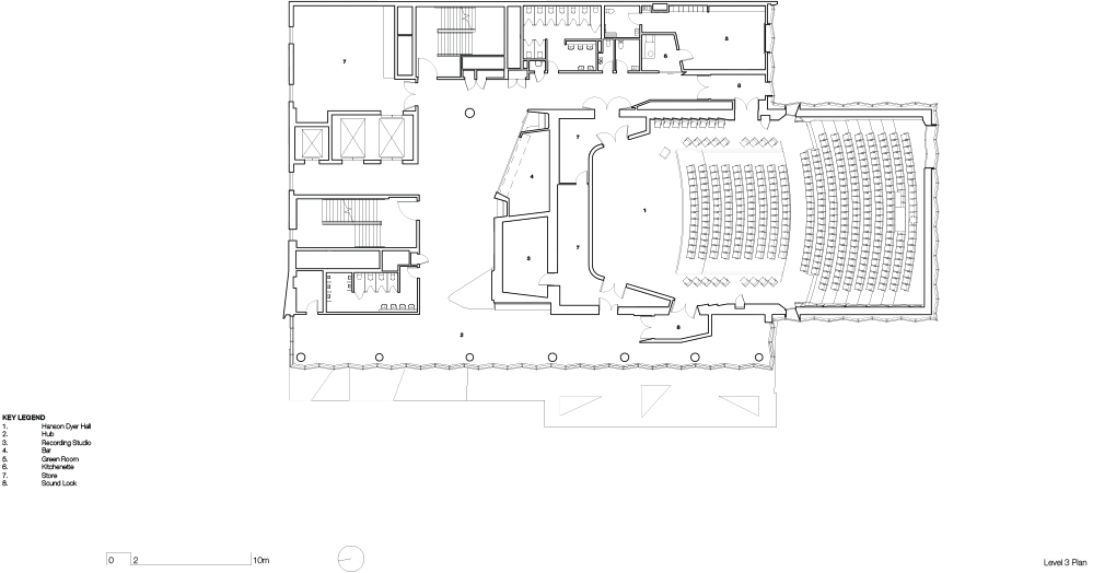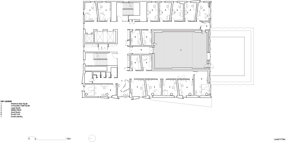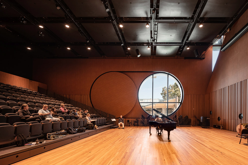 Outwardly focused and inviting, the building balances the singular concentration required of students with the camaraderie of engaging with others. The building is a place to rub shoulders with fellow music students, and the artistic milieu of the wider campus and precinct.