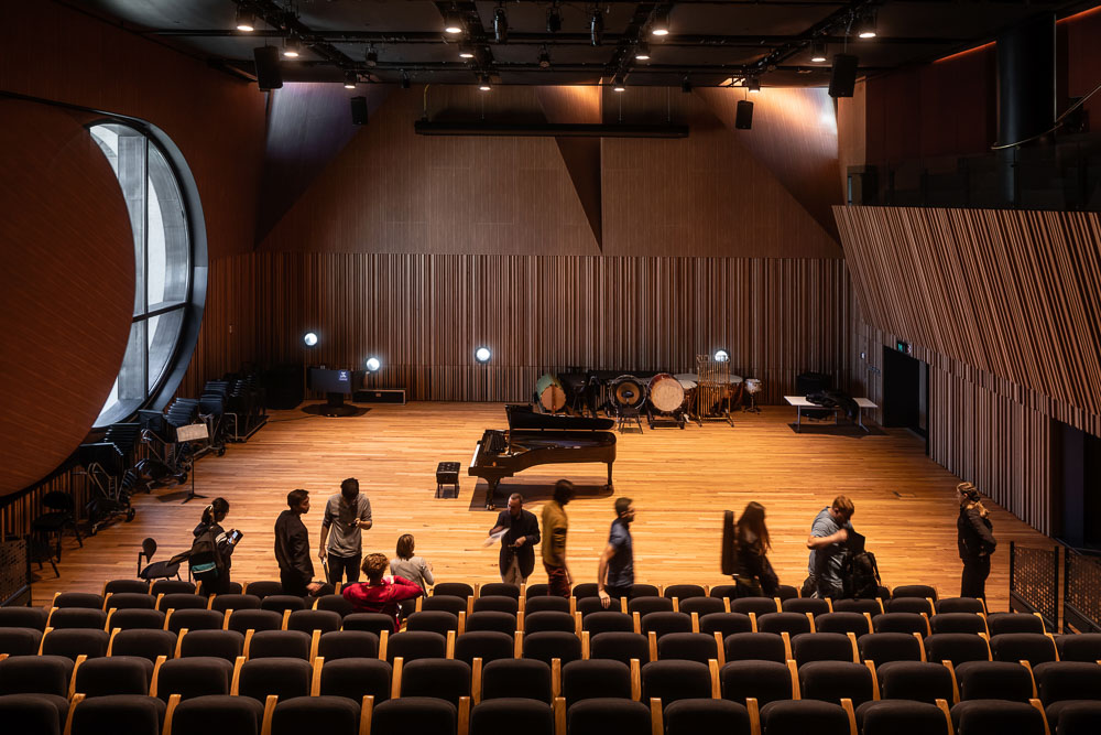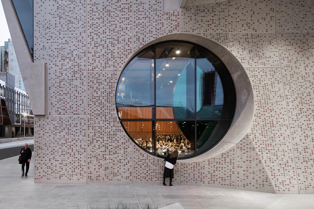 Numerous vantage points in the conservatorium allow for appreciating the inner workings of music teaching. Throughout the building, learning and rehearsal spaces are interspersed with bell-shaped portholes, hinged panels and disguised windows that generously exhibit the activity within. The largest of these apertures is the oculus window located on the ground floor of the orchestral rehearsal space, it offers passers-by a glimpse into the inner realm of music education.