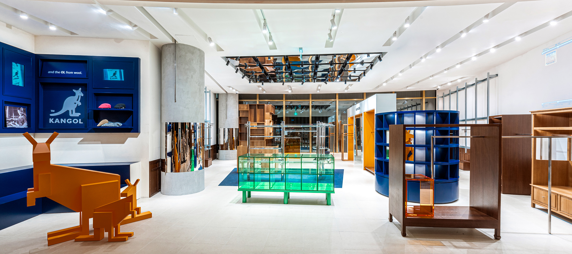 Moreover, the client requested a unique finishing material for Kangol that was not used by other brands, as well as a differentiated design for the display of their hats, their flagship product. For this, angora fabric, the origin of Kangol's name, was boldly applied to the exterior design and made to be seen metaphorically with the lighting of the brand logo.
