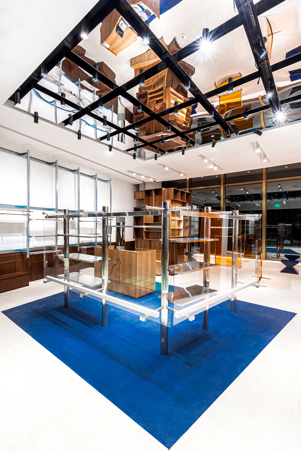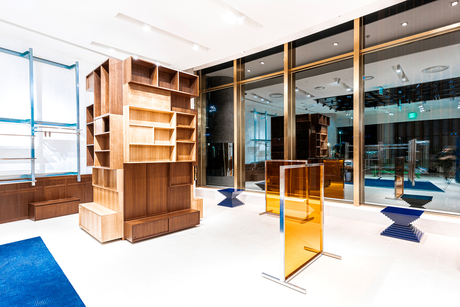 NiiiZ Design LAB, the office in charge of the design, directly and indirectly [expressed / expresses] Kangol’s heritage with the design concept of “All elements of the space become objets”. They aimed to create a design differentiated from the spaces of existing fashion brands, especially street fashion brands, by taking each and all the spatial elements needed in a fashion space, such as fitting rooms, hangers, counters, and the furniture displaying accessories such as hats and bags, which are the brand’s main products, and turning them into objets. Therefore, not all elements of the space are in harmony or unified in materials and shapes. They all have different heights, colors, shapes, and materials. In this way, the elements of the space with different materials and shapes were designed to become one new space.