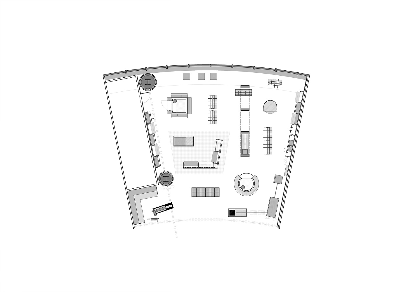 Furthermore, the typical display method of hats, which are normally stacked vertically, was avoided and a new display method and display efficiency were implemented by combining the cylindrical structured fitting room with the hat display shelf, or combining the hat display shelf with the fitting room.