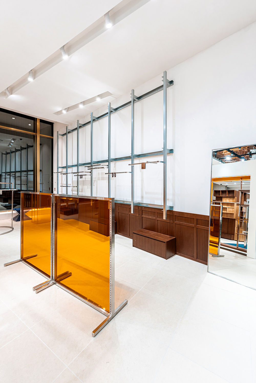 NiiiZ Design LAB, the office in charge of the design, directly and indirectly [expressed / expresses] Kangol’s heritage with the design concept of “All elements of the space become objets”. They aimed to create a design differentiated from the spaces of existing fashion brands, especially street fashion brands, by taking each and all the spatial elements needed in a fashion space, such as fitting rooms, hangers, counters, and the furniture displaying accessories such as hats and bags, which are the brand’s main products, and turning them into objets. Therefore, not all elements of the space are in harmony or unified in materials and shapes. They all have different heights, colors, shapes, and materials. In this way, the elements of the space with different materials and shapes were designed to become one new space.