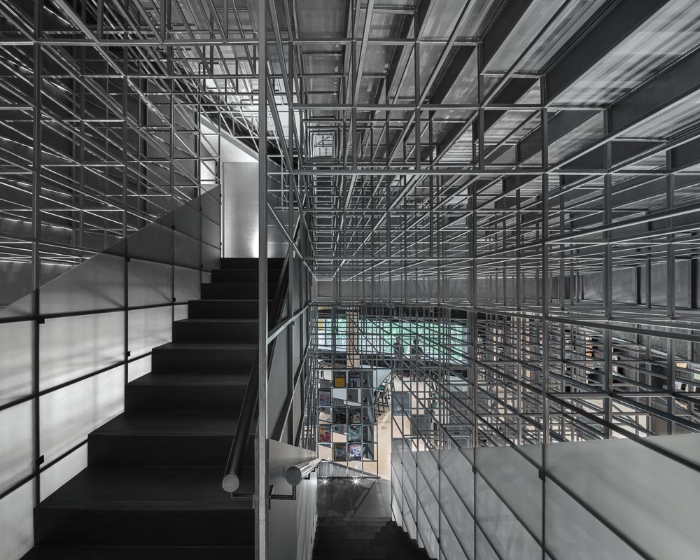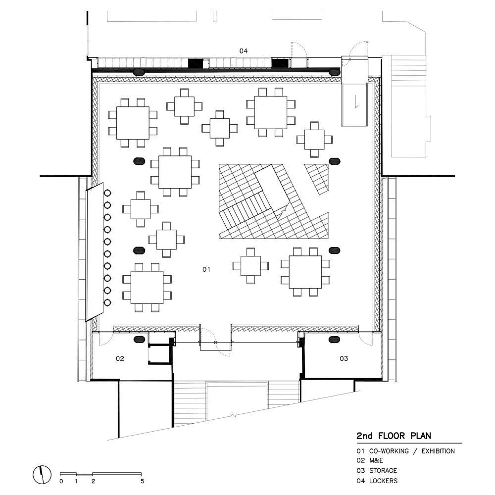 On its first level, a 3Ds grid system enveloping a co-working space provides an open-ended platform for students to create exhibitions or various events, to hang, fasten, insert, or to do anything with it. It becomes an experimental ground for architecture students to act on the space. The ever-changing exhibitions from various studios in the schools could inspire one another. The system is also available for pin-up spaces with magnetic pinboards and digital screen where anyone who walk pass can stop by to join the discussions.