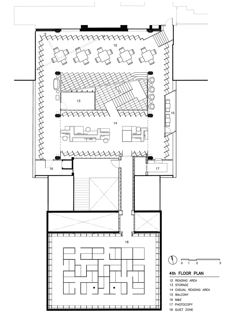 There still be a quiet zone for those who need to concentrate. Carrels are rearranged in a labyrinth configuration to minimize disturbance from the circulation around. The reflective ceiling reveals the plan of the luminous maze. On the top floor, the pixelated steps are reading area that, with rearrangement of the cushions, can be turned into an auditorium for occasional lectures or movies as another source of inspiration.