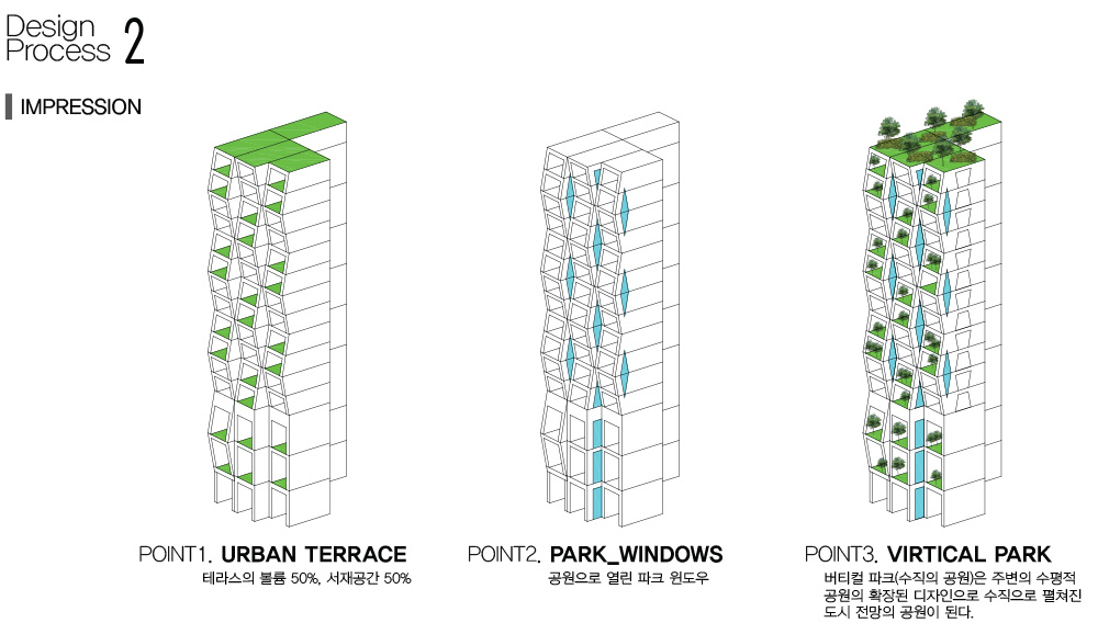 Poly 3) 풍경을 얻다(View_poly) 트리폴리는 개별공간이 외부와 만나는 창을 다채롭게 만들어준다. 2면 또는 3면으로 열린 수직의 풍경은 그 속에 ‘사람사는’ 모습을 외부로 드러나게 만듦으로써 도시풍경에 활력을 제공한다. 다양한 창과 테라스를 만드는 목적이 개별공간에 풍부한 빛과 풍경을 보태기 위함도 있겠지만, 주된 디자인 의도는 다방면의 창과 테라스가 프라이버시의 독립성에 간섭을 유발하도록 했다. 차단된 독립보다는 약간의 간섭을 통해 소통하고, 그 속에서 삶의 이야기가 펼쳐질 가능성은 ‘상호간섭’을 통해 열어두고자 했다. 이를 통해, 찾고자 하는 모습은 건축 입면에 ‘삶의 드라마가 펼쳐지는 도시풍경’이다.