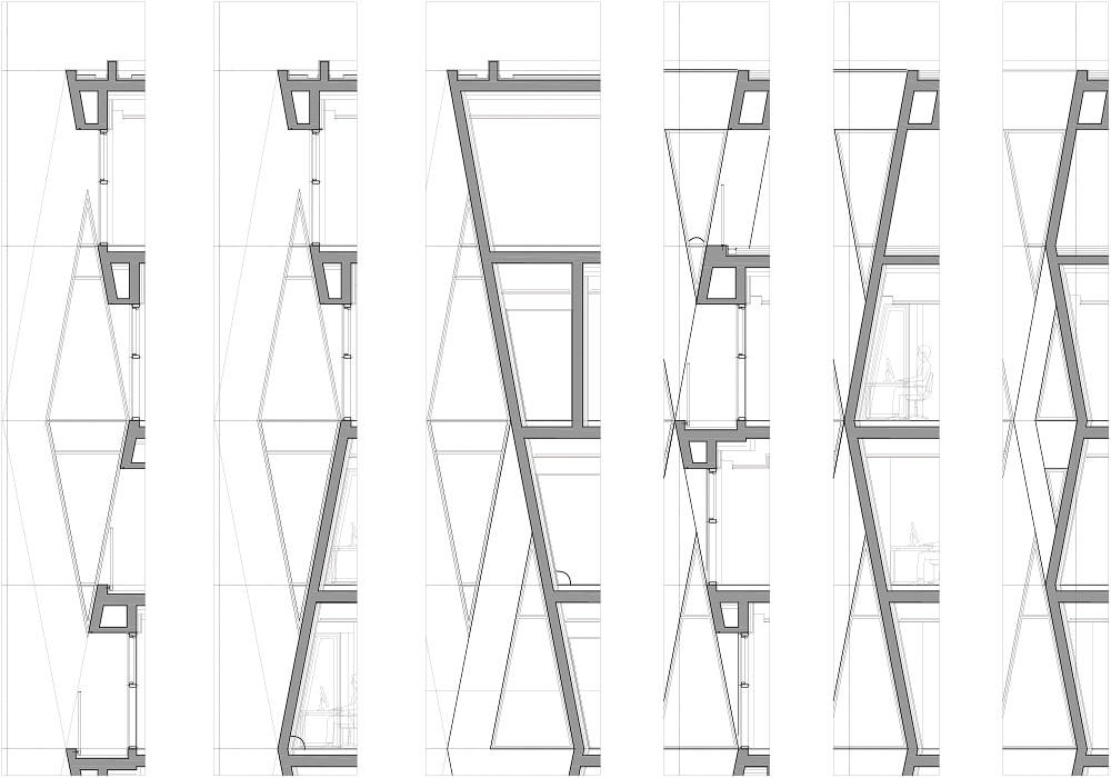 Poly 2) 틈을 얻다(Terrace_poly) 트리폴리는 삼각형구조의 반복을 통해 연결한 공간시스템을 의미한다. 지그재그(zigzag)로 엇갈린 수직패턴은 단조롭던 외관에 삼각형 틈을 만들었다. 삼각형이 만든 틈은 자연테라스를 만들 여유를 만들어 주었다. 삼각형의 내력구조는 하중을 지탱하고, 내부공간에 다채로운 창을 형성하는 디자인의 기준선이 됐다. 결과적으로 트리폴리가 만드는 틈은 내부공간을 외부로 드러나게 하고, 도시건축에 여유를 만드는 역할을 한다.