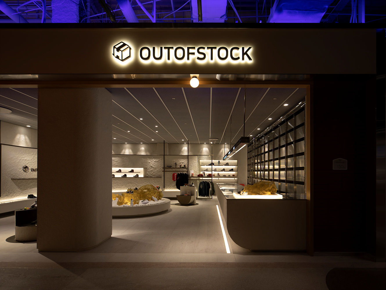 Outofstock의 매장은 단조로운 형식과 갇혀있는 정사각형 평면의 한계를 벗어나 곡면을 사용하여 열린 공간으로의 평면을 구성하였고, 이는 진입부에서의 매장과 제품의 주목성을 높이고 자연스러우면서도 역동적인 에너지의 순환을 의도하였다. 매장 내부는 제품 쇼케이스 영역, 제품 보관 ,검수 및 판매 영역, 그리고 스토어 기획과 디자인 메시지를 전달하는 art work 으로 크게 세 영역으로 구성되어 있다.