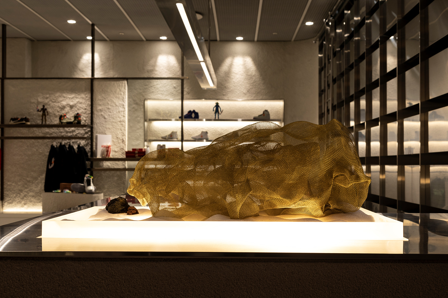 세번째 스토어 기획과 디자인 메시지가 담긴 art work 은 전체적인 컨셉을 현대적으로 재해석한 설치 조형 작품으로 아트 워크 작가와 콜라보레이션하여 제작 되었다. 거친 원시의 암석을 재해석한 조형물들은 메탈 매쉬 망을 사용하여 제작되었고 스테이지 바닥을 형성 하는 불규칙한 백모래 더미들 위에 자연스럽게 배치하고 그 사이 사이 원석과 같이 박혀 있는 제품들을 찾아보는 유머와 은유를 더하고자 하였다.