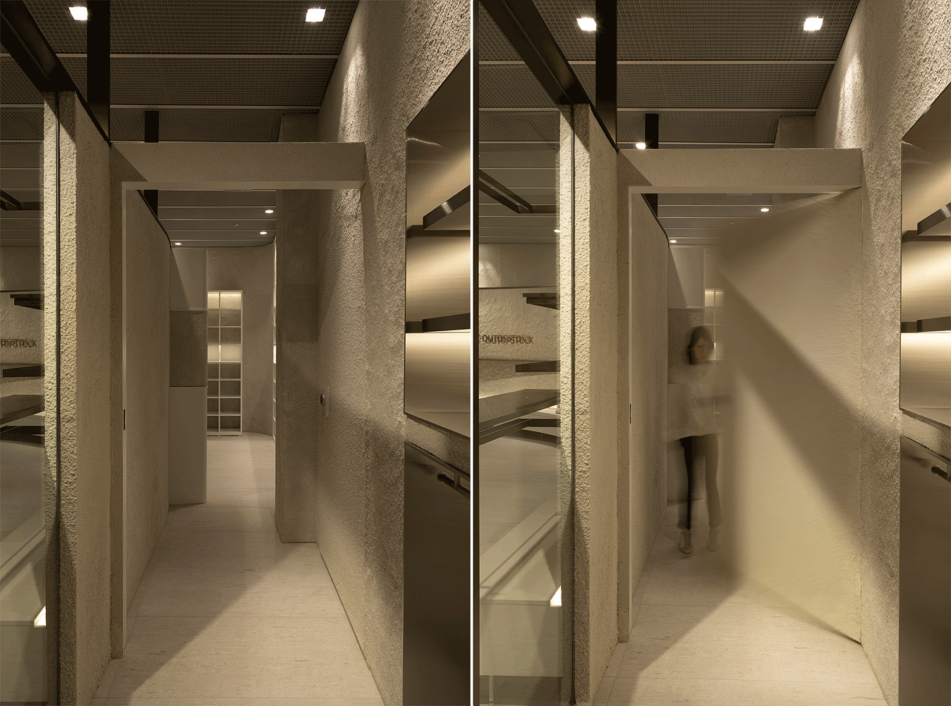 첫번째 쇼케이스 영역은 평면에서 좌측에서 시작하여 가장 긴 장 축으로 이루어진 곡면으로 자연의 거칠고도 밀도 있는 질감을 통해 그 위에 중첩되는 제품들의 존재감와 가치가 디테일 하게 드러날 수 있도록 디자인 하였다. 특히 벽면의 마감은 규사를 가공하여 개발된 것으로 이를 통해 Outofstock 만의 질감과 언어를 표현하고자 하였다.