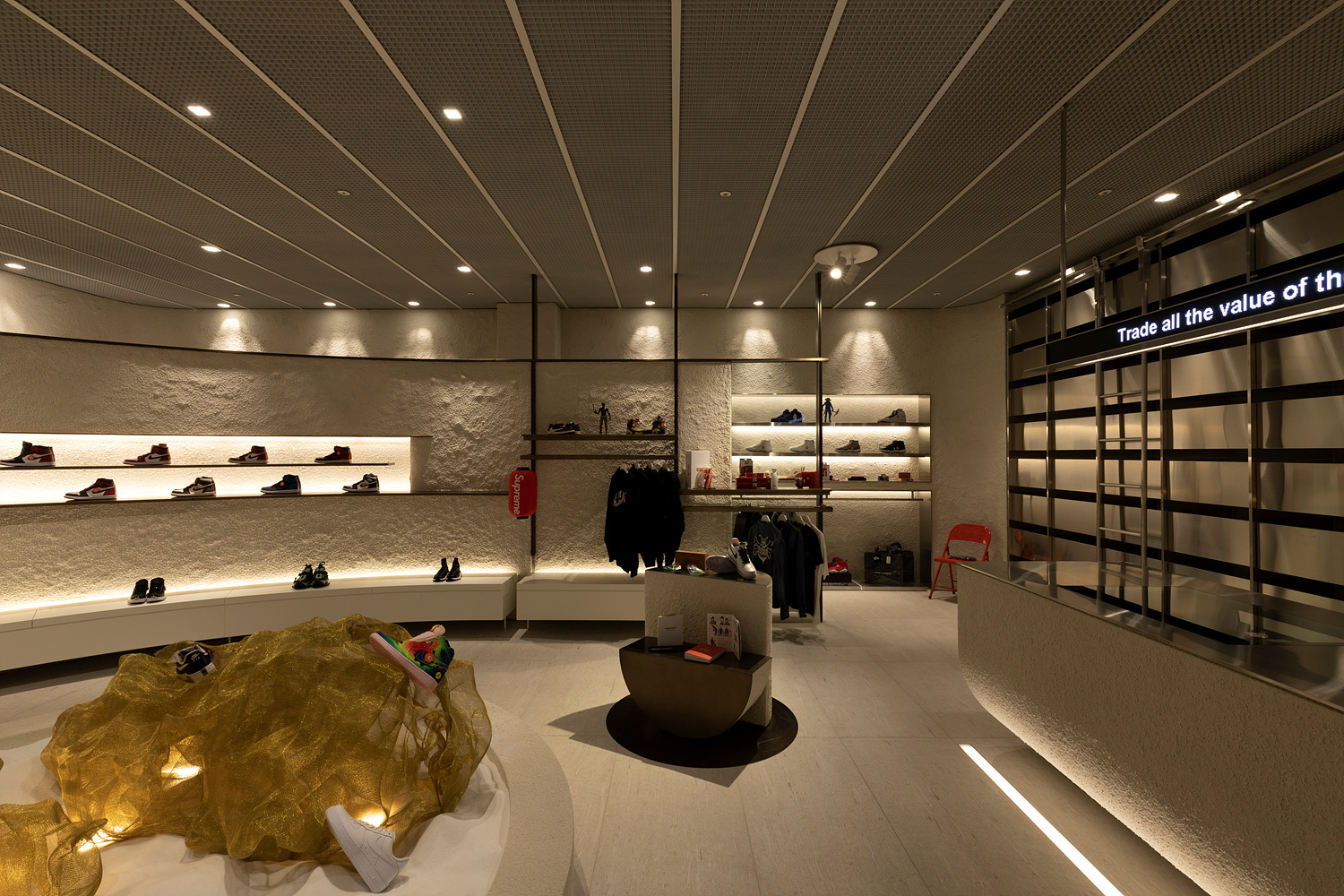 두번째 우측의 제품 보관 ,검수 및 판매 영역은 벽면 전체에 금속을 사용하였고 실시간으로 제품의 가격 정보를 제공하는 디지털 전광 패널을 함께 구성하여 리셀 플랫폼으로서의 정체성을 물성과 시스템 자체에서 드러내고자 하였다.