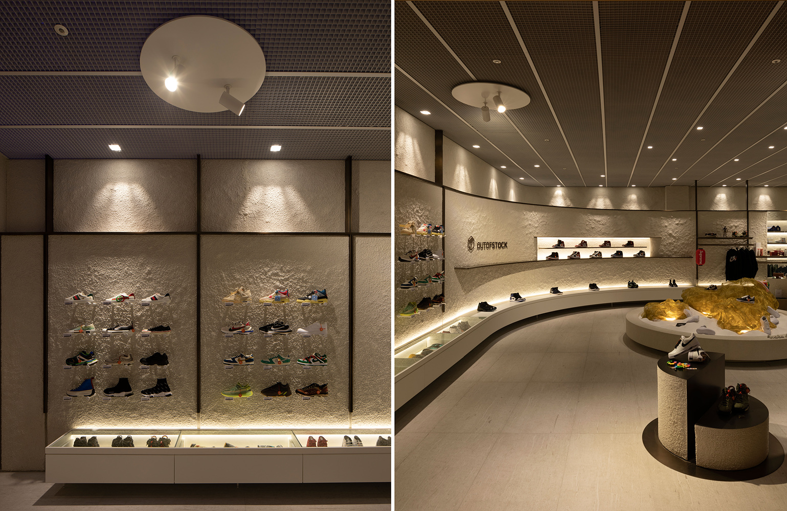 The first area, the showcase area, is a curved surface that starts from the left side of the flat plane and is along the longest axis, and it was designed so that the rough, yet dense natural textures could show the presence and value of the products overlapped in detail. In particular, processed and developed silica sand was used for the finish of the wall, and through this, the texture and language of Outofstock were intended to be expressed.