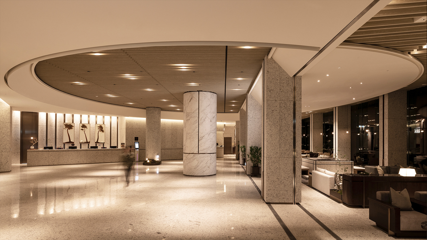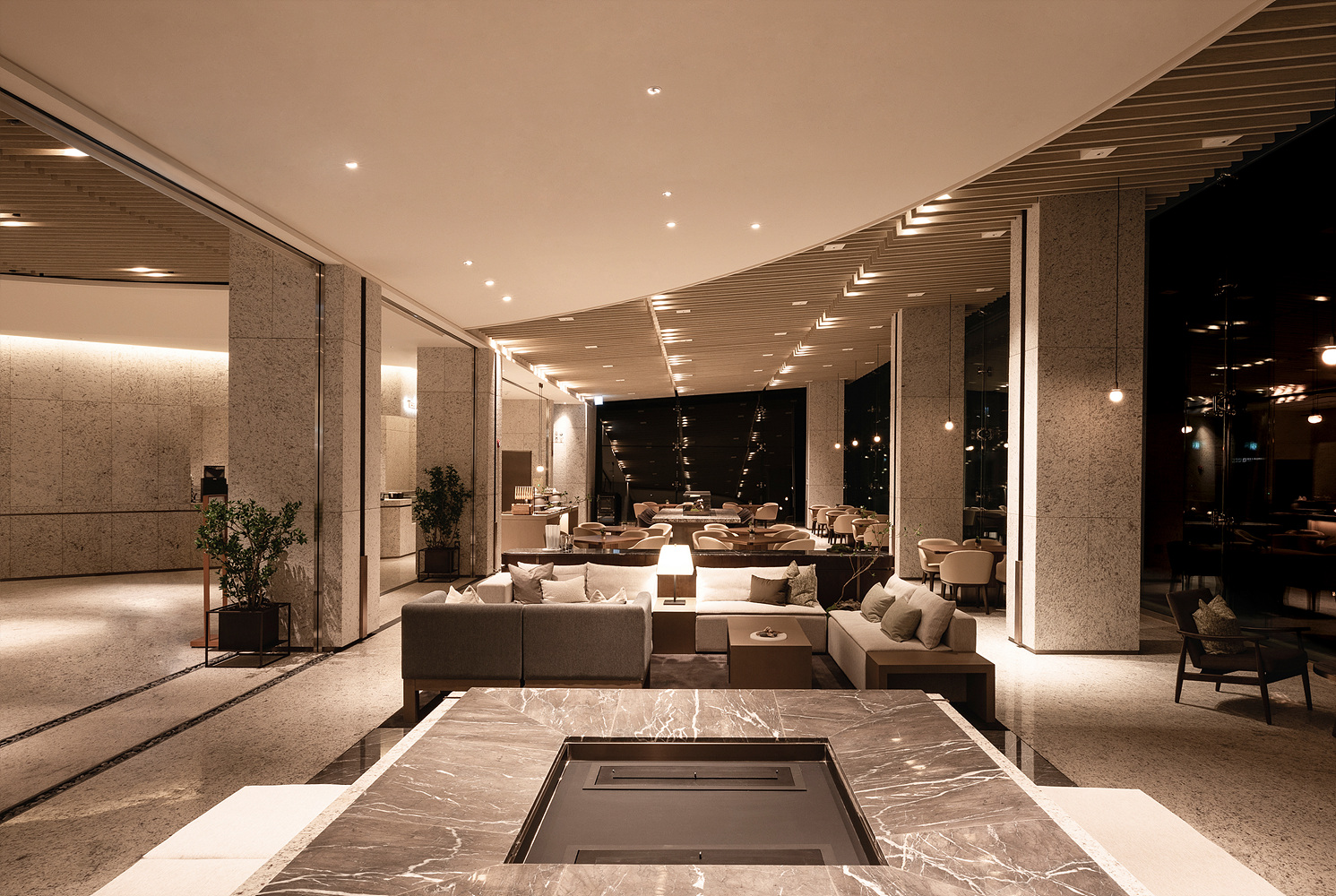 As they are Korea’s representative sites, we thought that it should be a space that contains local sentiments more than any other space. Consequently, we thought that everything in completing the composition and details of the space had to be done within one sentimental context, and each space was designed to maintain their originality and uniqueness. The reception desk, lobby, and lounge for check-in on the 10th floor were separated by arranging the floor stepping zones and natural stones together around the central architectural pillar. In addition, each of the circular pillars and colonnade that were designed along with the lighting was made to have a structural function as well as exist as an objet at the same time. In particular, the ceiling height of the lobby and lounge differs by about 1m based on the colonnade due to the structural reasons of the rooftop infinity pool. This condition allowed us to develop a design that provides the expandability of the space’s vision by using the inclination angle step difference.