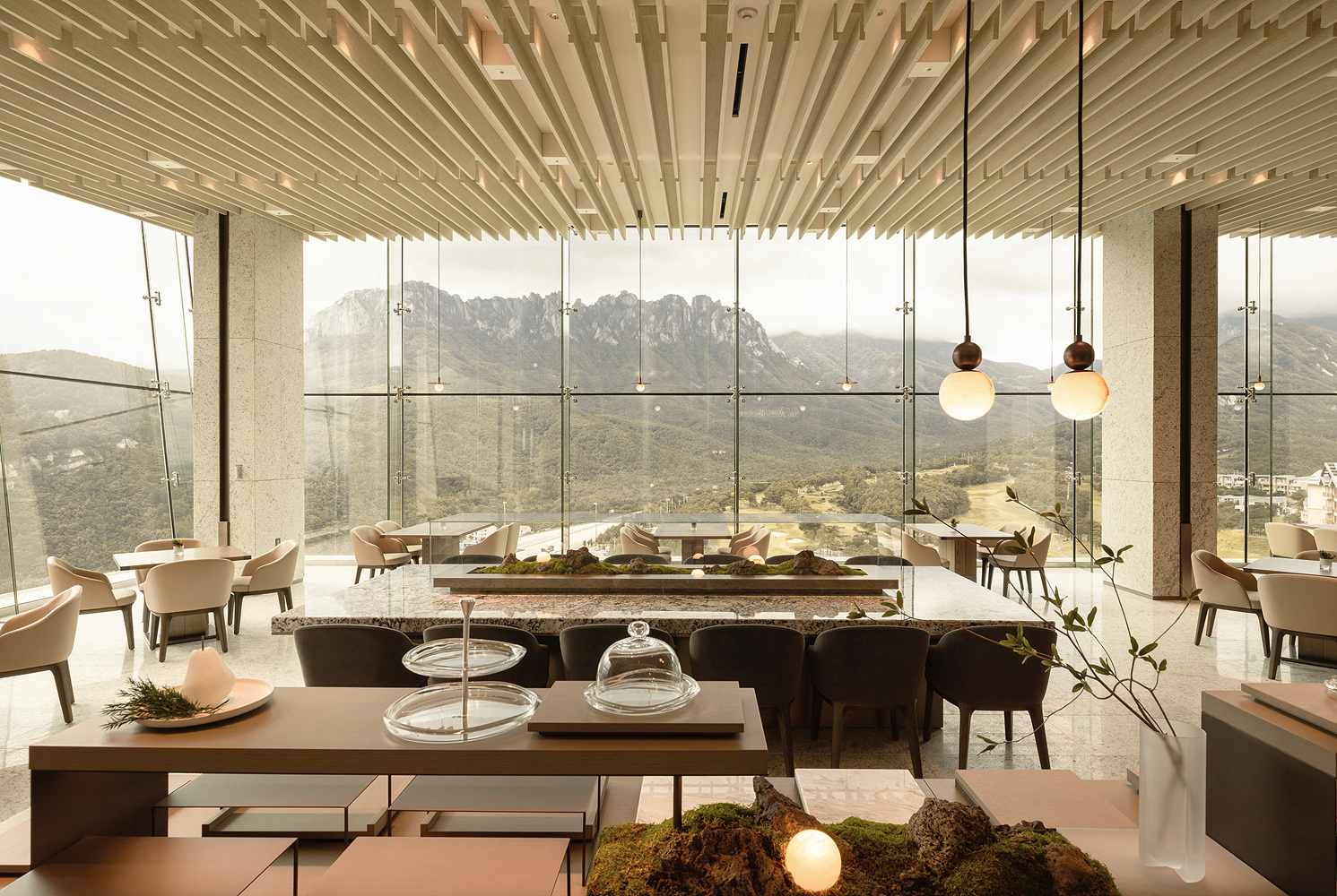 The ceiling of the lobby and lounge were intended to be completed with the outlines and morphological aesthetics of the restrained curves, and the circular ceiling connecting the lobby and the lounge was made to have an inclined angle to allow the open view and the panoramic view surrounded by nature to be dramatically experienced along with the grandeur of the lobby and lounge. Moreover, the lounge was designed to be a space where one can feel the impression of nature’s aloofness while enjoying the warm sunlight within the scenery of nature and enjoy the changing scenery of Seoraksan Mountain and the stars in the night sky while sitting by the warm fire of the Firefit. The stairway leading to the rooftop infinity pool was designed to naturally connect the sentimental sequence of the lobby, and the landscaping designed with the motif of the natural terrain with Seorak as its background was created with lighting so that the energy and sentiment of nature can naturally circulate inside.