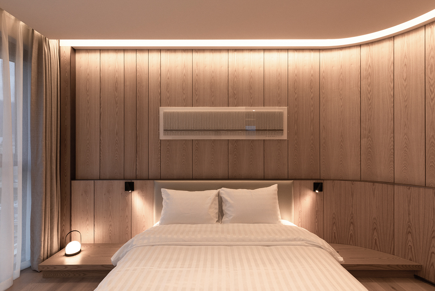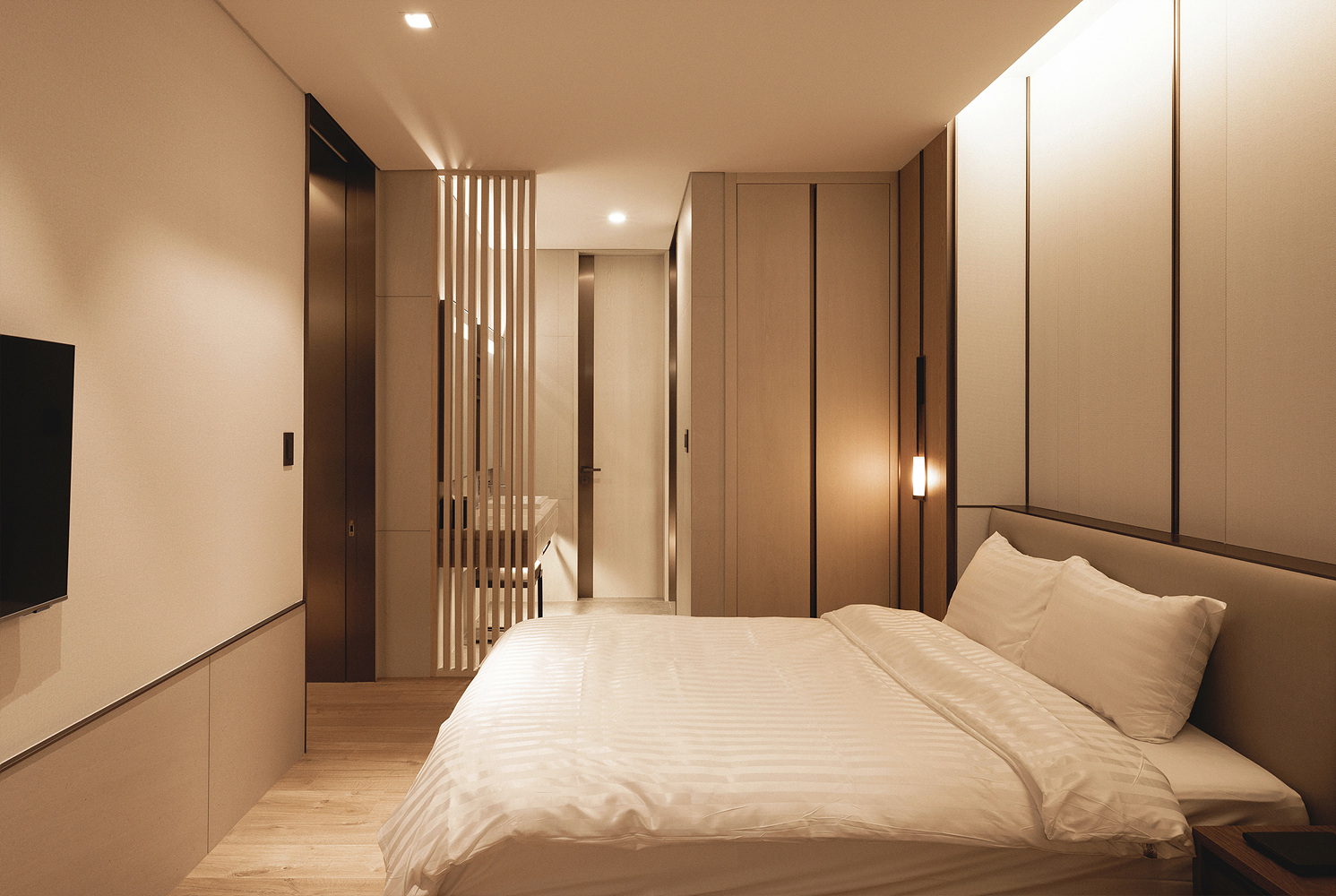 총 211개의 4개의 타입으로 구성된 객실은 객실마다 출입구에 근접한 벽체를 라운드로 조성하여 시야의 확장을 최대한 이루고 , 설악의 사계가 안과 밖에 자연스럽게 공존 할 수 있도록 설계 하였다. 공간 사이의 경계를 열림과 닫힘으로 모호하게 하여 공간의 연결과 중첩이 가변적으로 이루어지도록 설계하였고 ,이를 통하여 공간의 깊이와 기능이 사용자에 따라 다양하게 존재하도록 디자인 하고자 하였다. 온천수 스파를 실내에서 프라이빗하게 경험할 수 있는 SPA ROOM은 큰 창호 뷰 프레임을 통하여 자연 경관을 바라보며 스파를 즐길 수 있고 ,동시에 자연의 질감과 물성을 지닌 소재와 적절한 빛을 사용함으로 간결한 조형과 질서 안에서 따뜻한 자연 속 온기를 조성하도록 디자인 하였다. 마지막으로 ‘문명의 복잡함에서 벗어나 자연 속의 건축 안에서 설악의 자연과 함께 심신을 다듬고 치유할 수 있는 온전한 휴식과 자유를 누리는 공간이 되기를 바란다.’