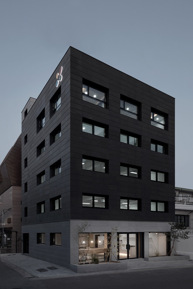 To establish a strong presence within the urban grid of Seogyo-dong, we proposed an exterior using heavy macheon granite. Goheung granite, which is brighter than macheon granite, was used as the exterior on the lower floor to reflect the image of the flower cafe, and to accentuate the sense of mass of the upper floors. We tried to embody a contrast through the difference in brightness of the elevation, and make it seem as if the building was floating. The stones were horizontally joint, but the upper parts were cut at 45 degrees to give emphasis.
