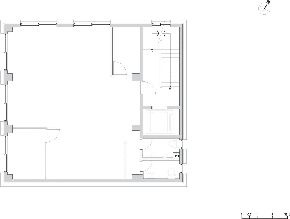 기존 화장실 전면 위치를 엘리베이터 후면인, 내부로 변경을 하고, 그 자리에 엘리베이터를 삽입하기 위한 철거 및 구조 보강공사가 장기간 진행되었다. 내부 공간의 효율성을 극대화하기 위해 대공간을 만들어야 했고, 구조설계사와 함께 구조보강은 최대한 외벽 쪽으로 구성하도록 하였다. 도로 사선제한도 적용받지 않기 때문에 그 부분을 철거하고 새로이 벽체를 구성하여 오롯한 존재감을 위해 입방체의 형상을 만들고자 하였다.