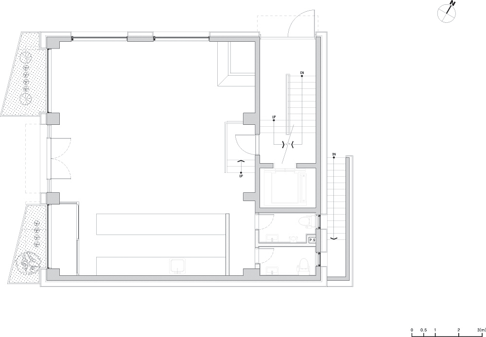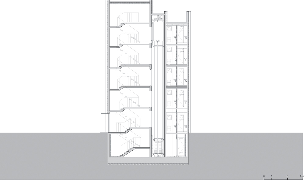 The initial form of the building had a dry-bit exterior, and this was also the result of using splice-joint construction over an exterior of porcelain tiles in the past. According to past laws, the front of the building had been cut due to the setback regulation from road width. Since the building had a ramen structure up to the fourth floor, and a load bearing wall structure on the fifth floor, the request for structural reinforcement was vital for the client, who was planning to use all floors as an office building. In addition, since the building did not have an elevator despite being a five-story building, it was essential to remove corresponding slabs on all floors and reinforce the structure to install an elevator. An overall major repair project was carried out with the goal of forming a cafe on the first floor, office spaces on the second to fifth floors, and a complex cultural space on the basement floor. It was a major repair project that reconstructed all internal and external elements, including reinforcement of the frame structure.