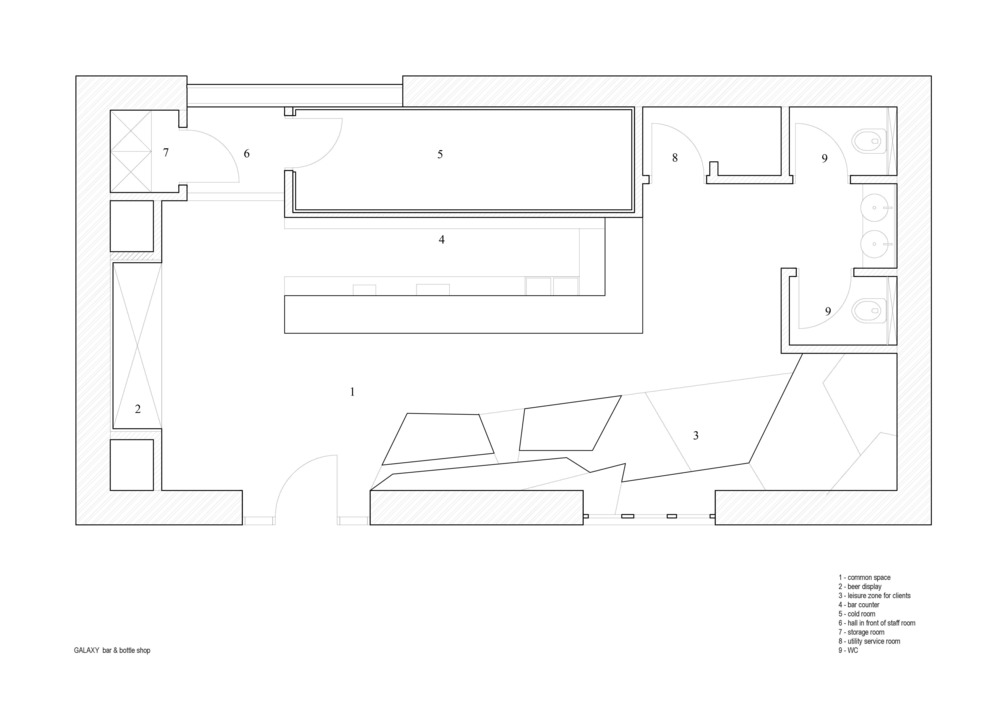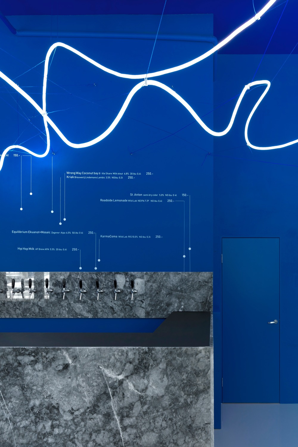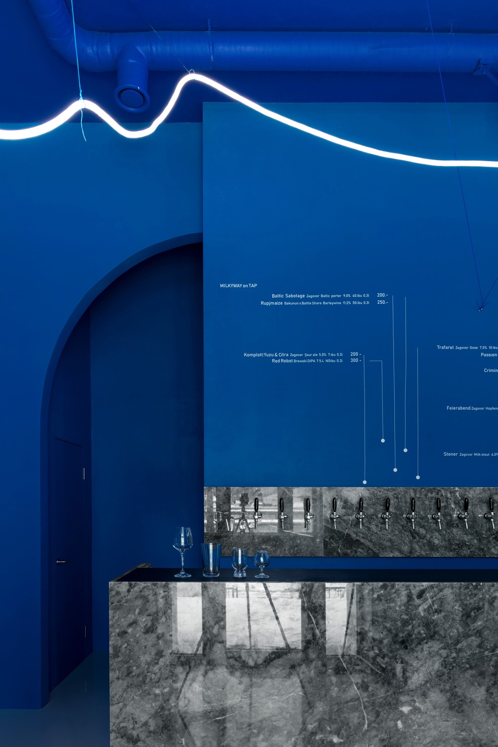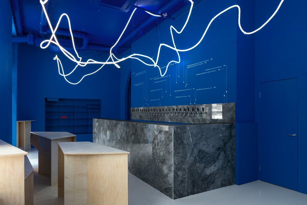 신고전주의 양식의 모스크바 건물을 배경으로 한 수제 맥주 양조장의 파란색 단색 인테리어와 기하학적 형태는 "러시아 우주주의"와 "극단주의"의 철학적 요소를 구현하여 자유와 상상력을 키우는 분위기를 조성한다.