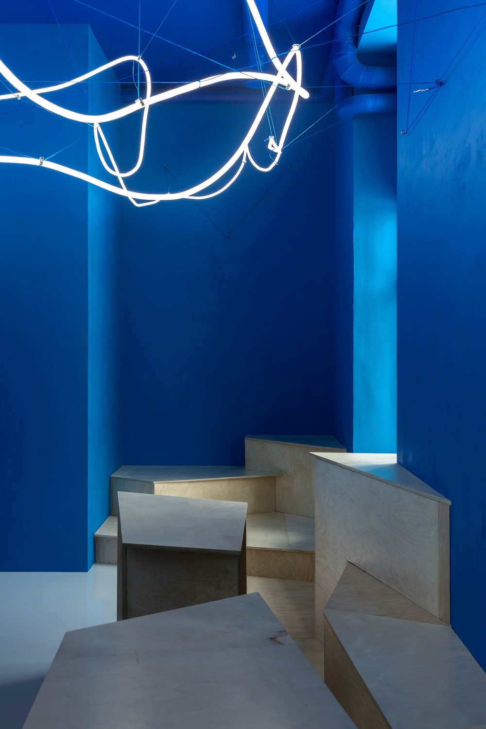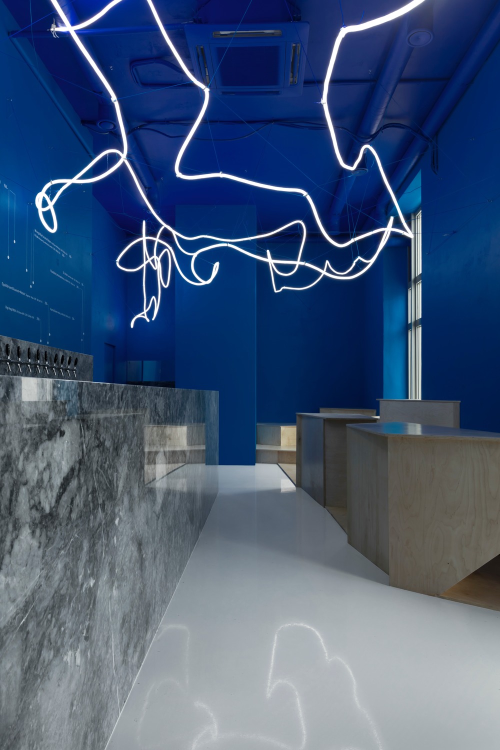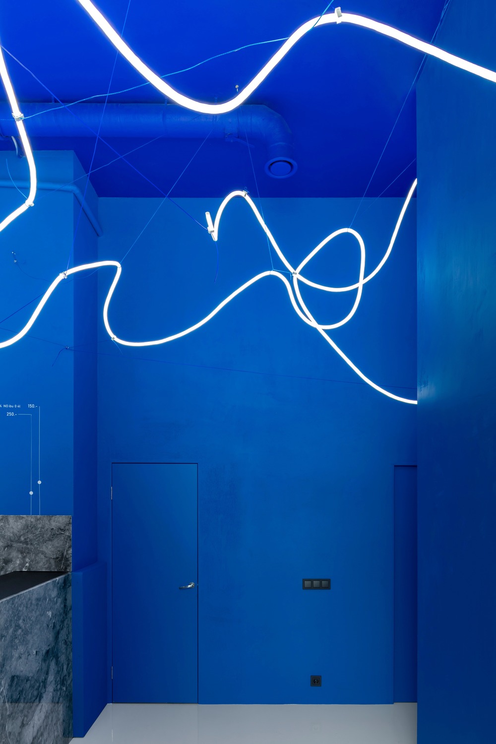 Layered over the space’s bright blue hue, Monoloko endeavored to create a heavenly atmosphere resembling a limitless universe through the creation of a spatial light installation, consisting of flexible neon light enveloped in a polyurethane shell. The resulting effect is the perception of a non-objective free space, where patrons can take a step back from their traditional views of time and substance.