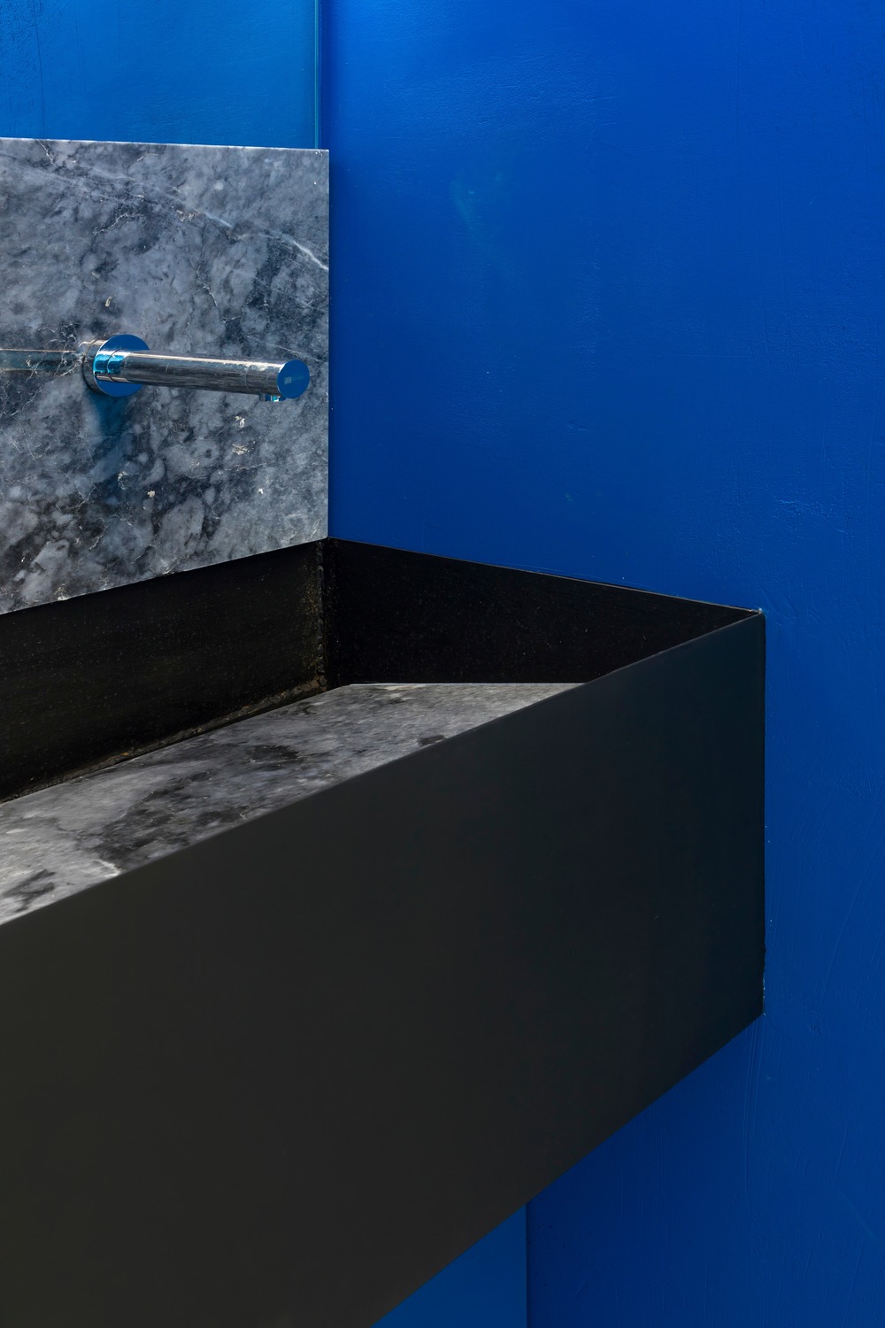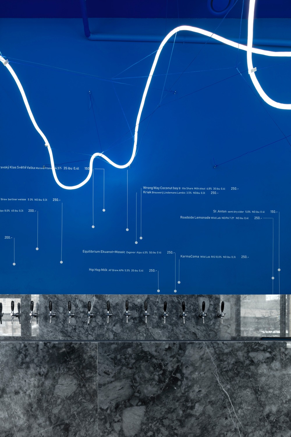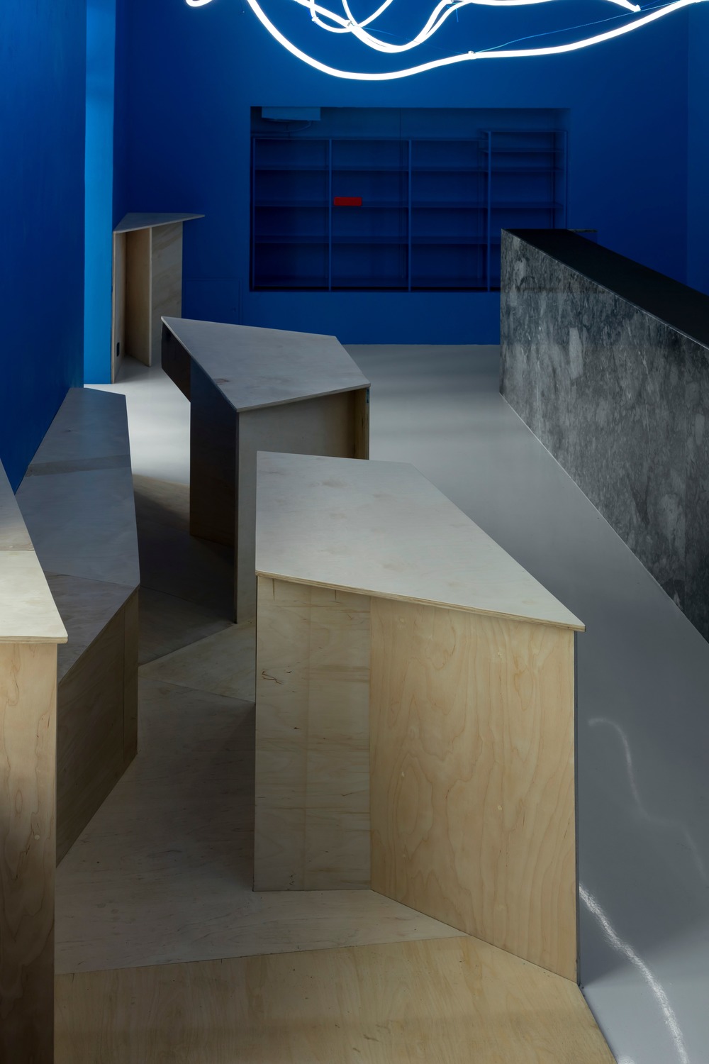 Layered over the space’s bright blue hue, Monoloko endeavored to create a heavenly atmosphere resembling a limitless universe through the creation of a spatial light installation, consisting of flexible neon light enveloped in a polyurethane shell. The resulting effect is the perception of a non-objective free space, where patrons can take a step back from their traditional views of time and substance.