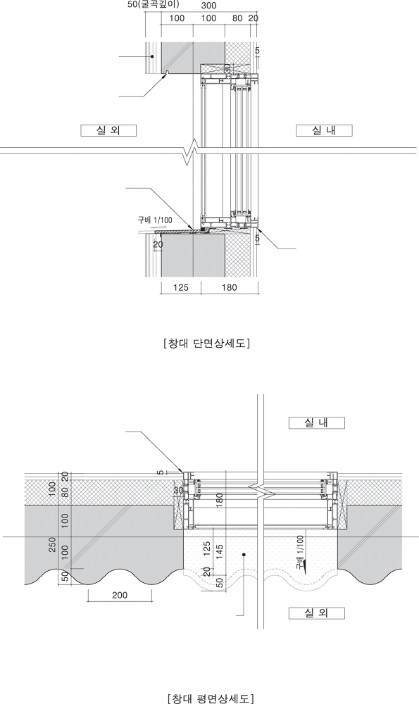 콘크리트의 내 오염성을 구현하기 위해 창대와 인방, 두겁 후레싱 부위에서 물끊기와 구배에 관한 디테일을 구현하려고 노력하였다. 콘크리트의 물결의 형상을 반영하여, 철판을 레이저 가공하여 처리하였다. 실질적으로 물결무늬의 콘크리트 구현이 완벽할 수 없기 때문에 2~4개 물결피치마다 두겁의 형상을 1:1로 탁본하여 레이저 커팅을 하였다. 30mm 돌출 및 구배시공을 하였기 때문에 물끊기 역할을 할 수 있도록 하였다. 최초 석재를 워터젯 커팅하려 했으나, 예산의 합리화를 위해 열연강판으로 시공하였다.