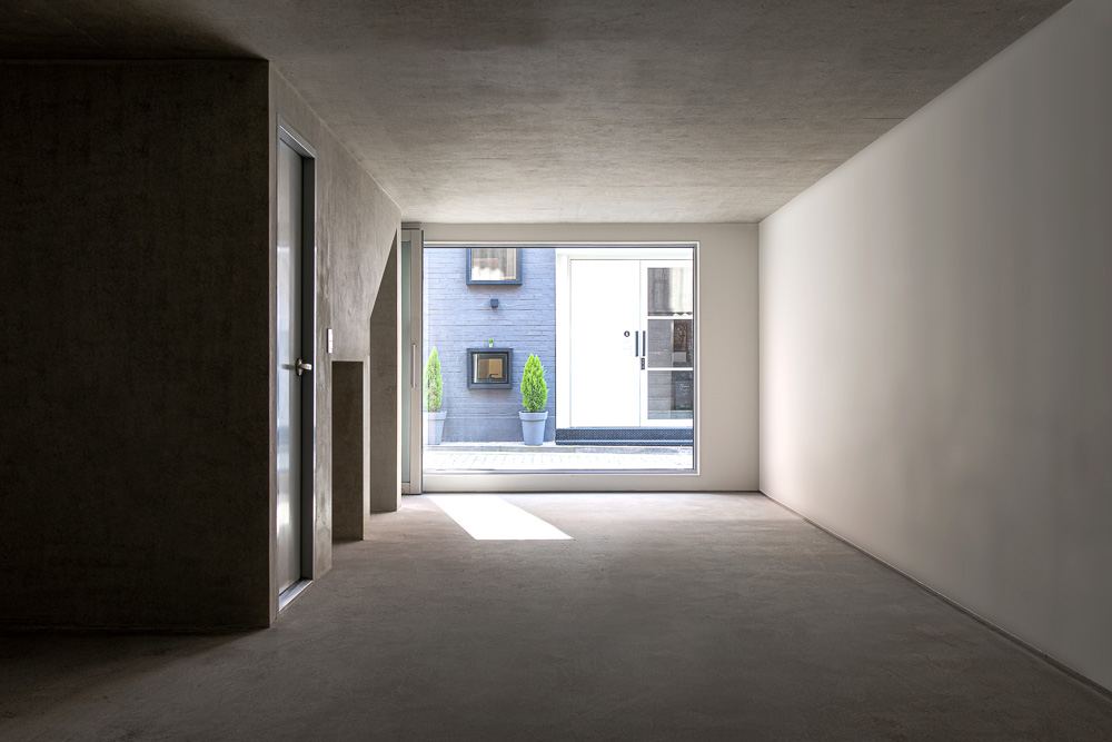 Internally, it was designed to simplify the moving lines most and to maximize the efficiency of space to be occupied by architecture on such a small site. It was alsointended for people to feel the rhythm and gen tleness of light, which are stemming from the harmony with the exposed concrete, inside the building by crossing darkness and brightness with the passages of light on the moving lines.