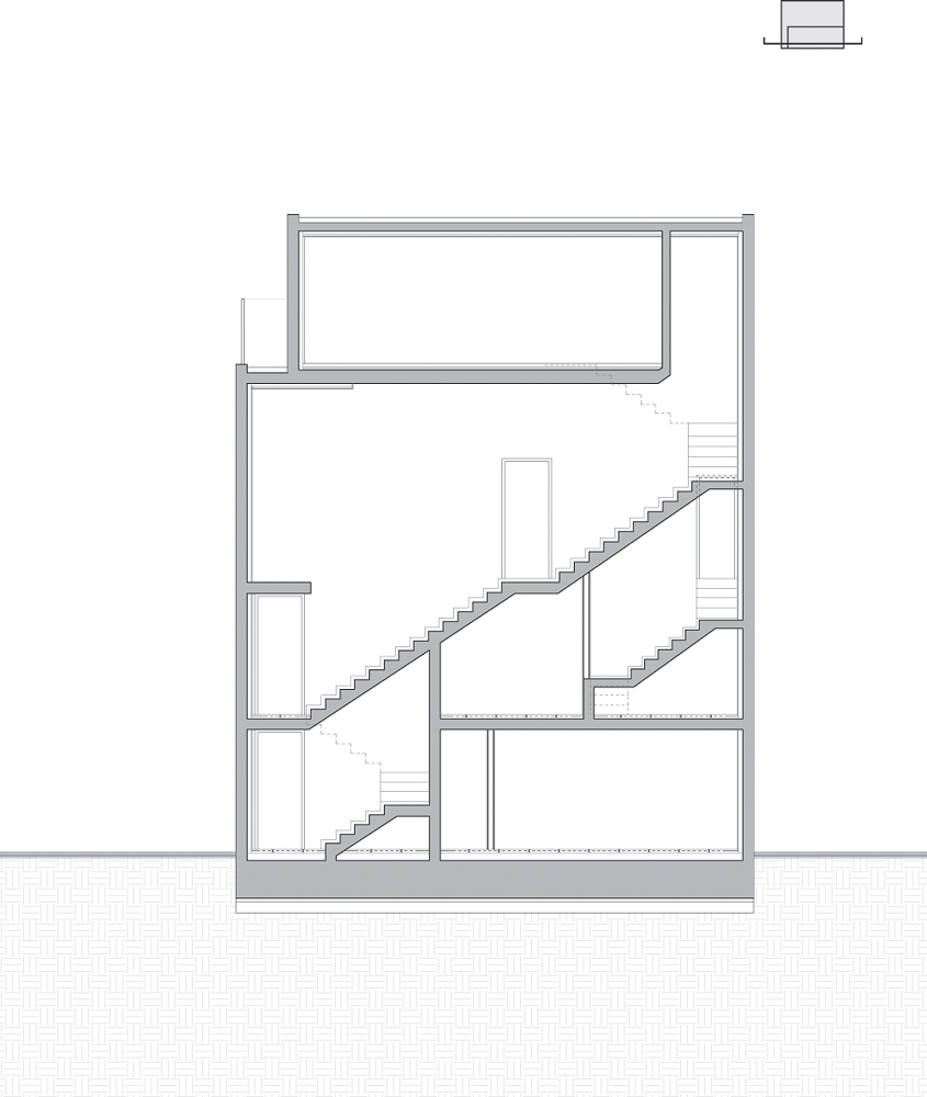 내부적으로는 동선을 최대한 단순화하며 작은 대지에서 건축이 차지할 공간의 효율성을 극대화하기 위해 디자인하였다. 동선 상에서 곳곳에 빛의 통로를 만들어 어둠과 밝음을 교차시켜 노출콘크리트와 어우러져 그리는 빛의 리듬과 온화함을 내부에서도 느낄 수 있도록 의도하였다.