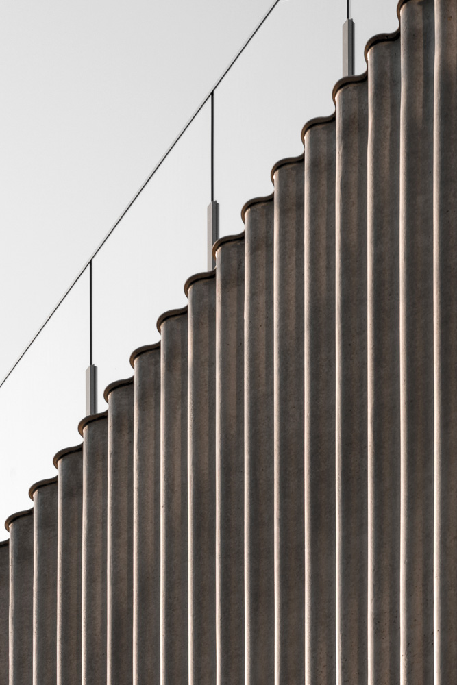 In order to realize the stain resistance of concrete, we tried to implement details about drip and gradient in the window sill, lintel, and capping flashing. Reflecting the shape of the waves of the concrete, the steel plate was processed by laser. Since the realization of concrete with wavy pattern cannot be perfect, laser cutting was performed by rubbing a thick shape 1:1 with every 2 to 4 wavy pitches. Since the building was constructed with a 30mm protrusion and a slope, it was designed to be able to act as a throating. At first, we intended to water-jet cut stone materials, but to rationalize the budget, HR plates were used in the construction instead.