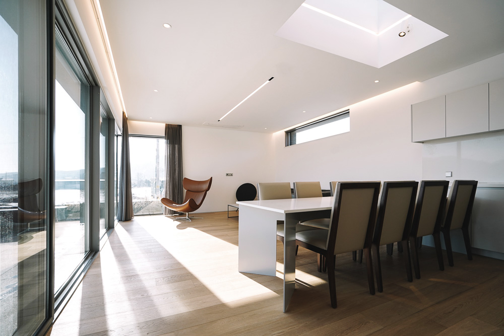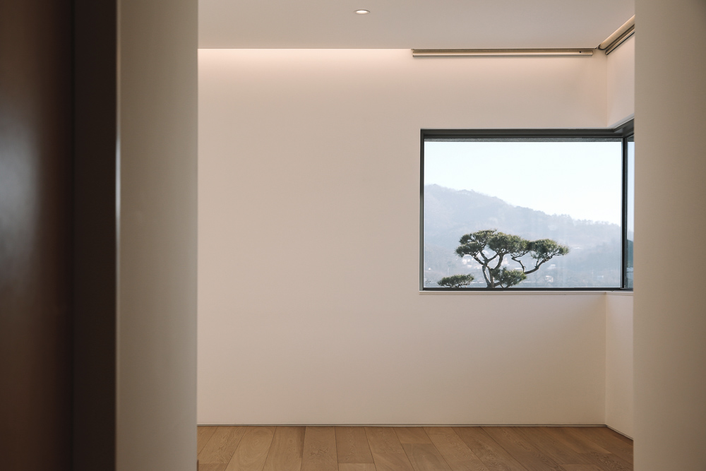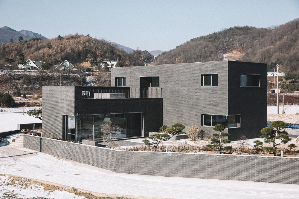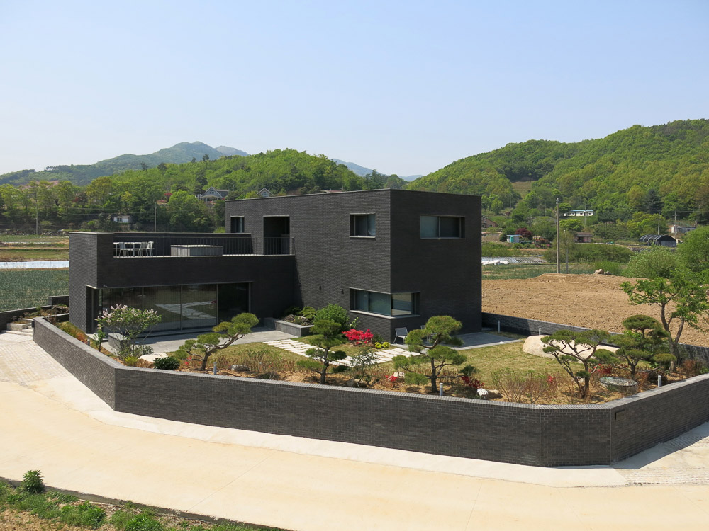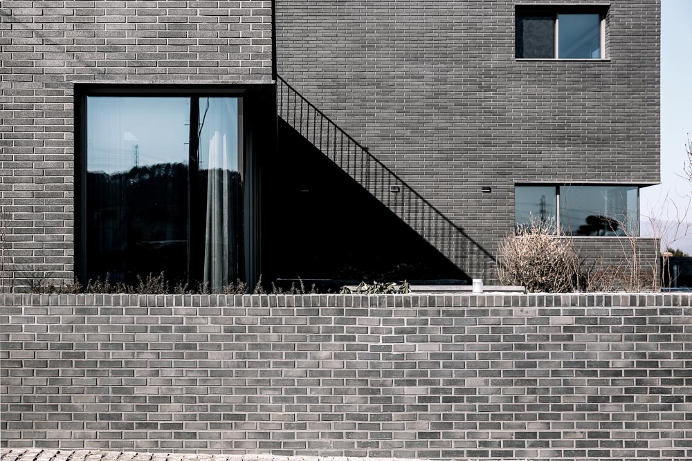 Just as the reason that the roof tiles of Korean hanoks are black is to allow it to be humbly settled in nature, we designed this house with the intention that maintaining the achromatic and geometric purity in architecture is an attitude of humility for nature, which shows diverse and rich appearances in the four seasons. Rectangular bricks and stone were used as the main material, and metal was minimized. All windowsills and lintels were built with stone, and we made a lot of effort to match the division, joints, and extensions of materials. The landscaping, interior, as well as overall furniture were all designed and produced by LKSA, in collaboration with the client.