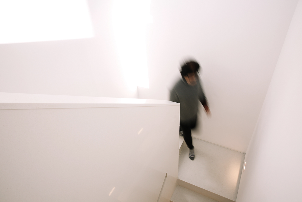 The theme was to provide a space where the three-generation family members, and sometimes the families of company members, can leave the city on the weekend to experience nature and enjoy the leisure of life. Therefore, the second-floor mass consists of four rooms with bathrooms in each room, and the first-floor mass consists of a shared living room and kitchen. External spaces such as a front yard, backyard, and terraces on the second floor were provided to allow various outdoor activities. It was designed as a cube, which is an essential form of architecture, reflecting the client’s outlook on life of wanting to leave the city and lead a life like a hermit in nature. Furthermore, the scenery of the river was restrained from the circulation of ascending the hill and parking, entering the site through the stairs, and arriving at the front entrance, and the space was formed so that the horizon of the river unfolds only when approaching the living room and each space. Just as Le Corbusier limited the landscape to embrace the landscape of the river in his ‘La Petite Maison’. The landscape was designed with restraint to deeply embrace the original landscape. By closing the landscape from the circulation and allowing the benefit of light (stair skylight, etc.) to be enjoyed, and by opening the landscape in the space of the settlement, we tried to create a rhythm to make an impression even though it is a small space.