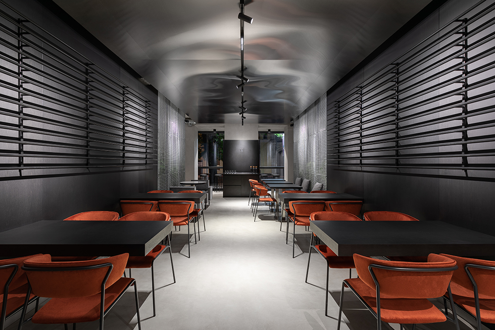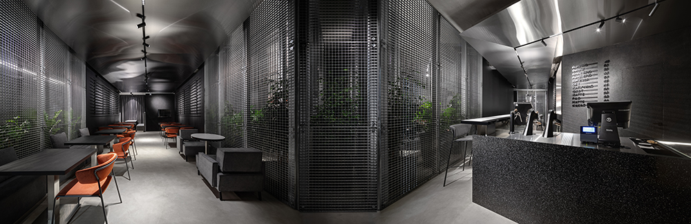 건축가는 "검정"을 공간적으로 해석하여 빛과 그림자를 소스로 사용했다. 완벽하게 매끄럽고 미끄러지는 반사 표면을 추가하여 공격적인 표면에 대응하여 풍부하고 깊은 질감의 변화가 있는 공간을 만든다.