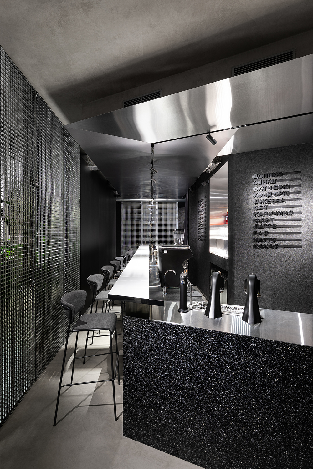 To counterbalance the aggressive texture of the sand, we added brushed stainless steel, as it is almost always used in professional equipment, we decided to reflect the professionalism in making coffee and cocktails in our interior. This is how stainless steel appeared in furniture, walls and false ceilings. Thanks to this, an interesting, unique play of reflections has turned out. The lowering of the stainless steel ceiling creates the effect of levitation, hiding ventilation pipes and other communications. The result is a minimalistic ceiling with a minimum of sensors and lamps.