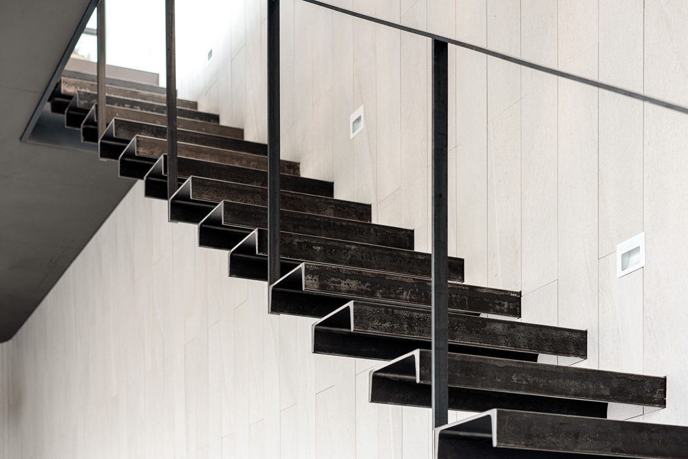 1층은 여러 사람들과 식사를 할 수 있는 거실로써 창호를 개방하면 전면의 넓은 데크 마당으로 내외부 공간이 혼합되며, 단차 없는 연속성의 성격을 극대화할 수 있도록 계획하였다. 2층으로 가는 계단은 ‘ㄷ’형강을 캔틸레버로 구축하여 수직 동선의 긴장감을 부여하고자 하였다. 조경과 내부 인테리어 및 가구 집기도 건축주의 고유한 감성과 안목을 반영하여 구성하였다.