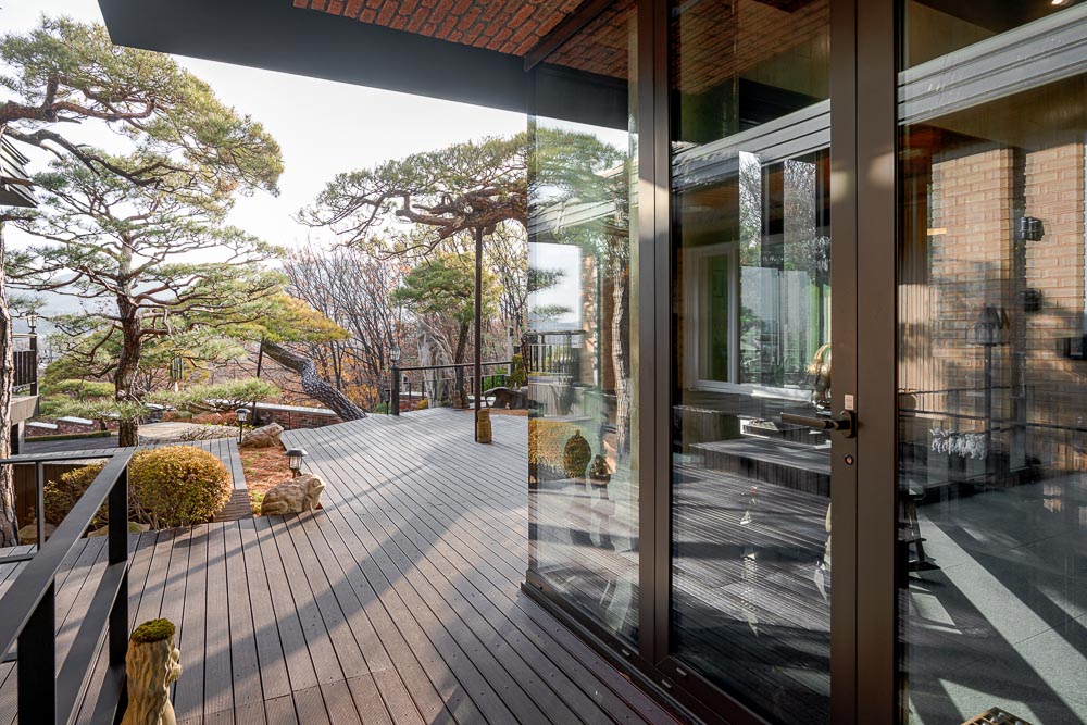 On the first floor, there is the living room where the client can dine with many people, and when the windows are opened, there is a large deck yard in front, and it was planned so that the internal and external space can be mixed and to maximize the character of step-free continuity. The stairway to the second floor was constructed with ‘U’-shaped steel cantilevers to give tension to the vertical circulation. The landscaping, interior, and furniture were also constructed by reflecting the unique sensibility and perspective of the owner.