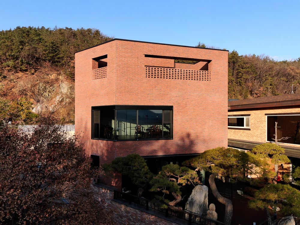 기존의 전체 대지가 유려한 산세를 배경으로 한 경사지에 위치하고 있고, 조망의 가치가 극대화된 곳이다. 따라서 내부 공간에서 그러한 뷰의 가치를 고양시키기 위해서 수직 동선을 배면으로 배치하였고, 개구부 또한 전면부로만 집중하여 동선상에 콘트라스트를 부여하여 설계하였다.