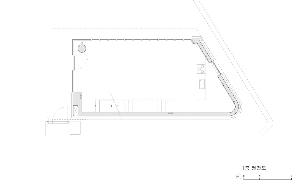 1층은 여러 사람들과 식사를 할 수 있는 거실로써 창호를 개방하면 전면의 넓은 데크 마당으로 내외부 공간이 혼합되며, 단차 없는 연속성의 성격을 극대화할 수 있도록 계획하였다. 2층으로 가는 계단은 ‘ㄷ’형강을 캔틸레버로 구축하여 수직 동선의 긴장감을 부여하고자 하였다. 조경과 내부 인테리어 및 가구 집기도 건축주의 고유한 감성과 안목을 반영하여 구성하였다.