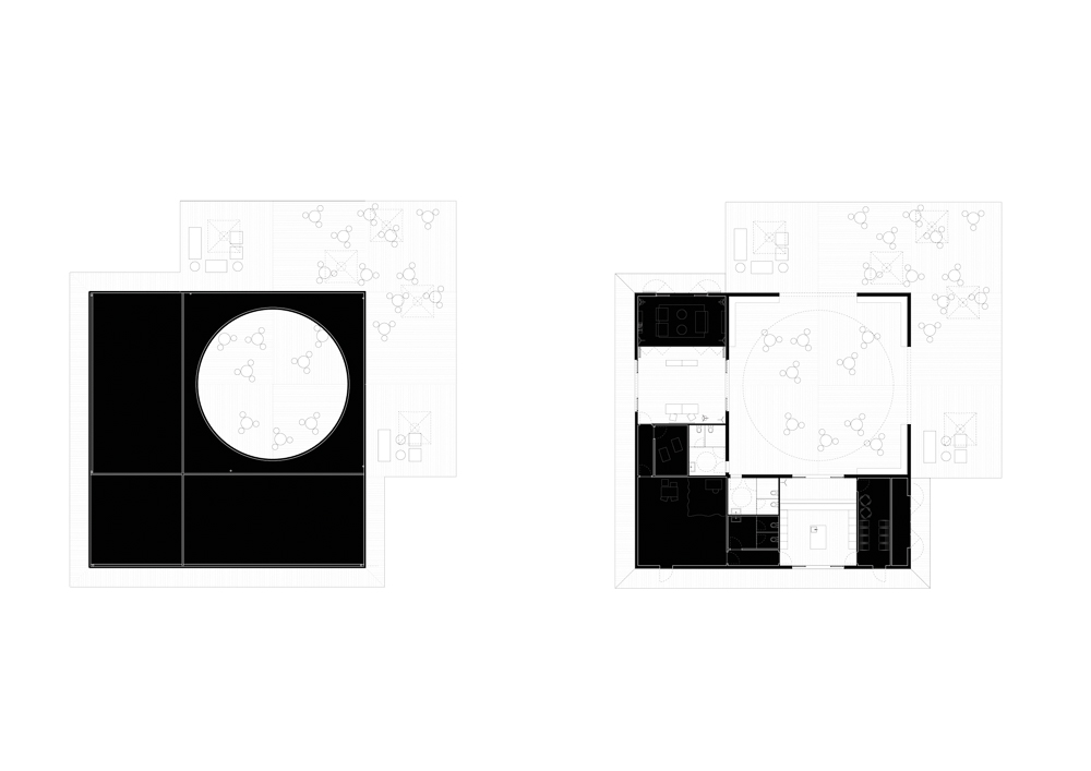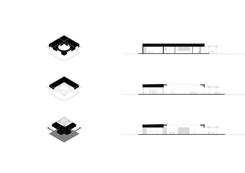 The floorplan is symmetric and nondirectional with each of the two main public spaces accessed from the centre of each side of the courtyard; facilities such as restrooms, staff and storage are located in the corner diagonal to the courtyard. The metric of the building is strict and reoccurring in all dimensions of its spaces and openings: its structural grid is simple, and the uniformly dimensioned spaces allow for the reorganising of the structure for a future change of use.