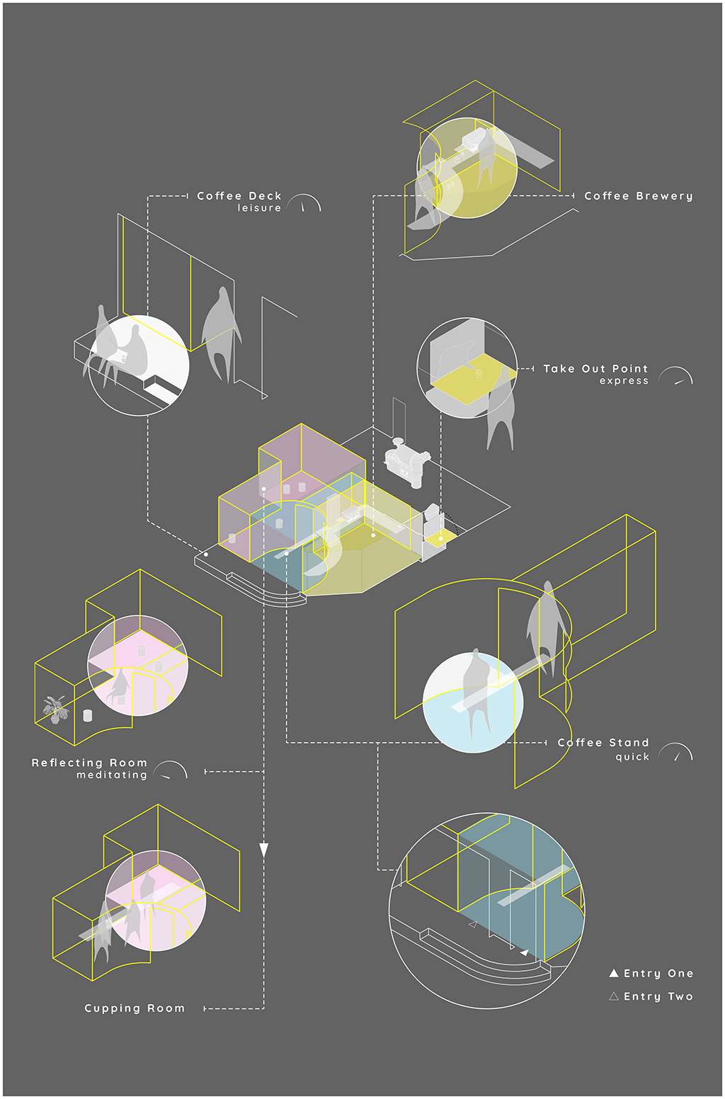 건축주의 요청에 따라 바 작업 공간, 로스터리 및 다목적실은 보안이 유지되어야 하며 특정 사생활이 보장되어야 했다. 내부와 외부 공간의 분할과 조명의 확산 효과를 주기 위해 강철 프레임의 불투명한 폴리카보네이트 패널을 사용했다.