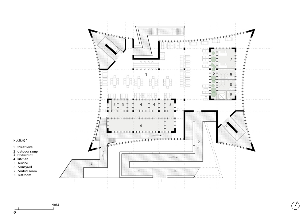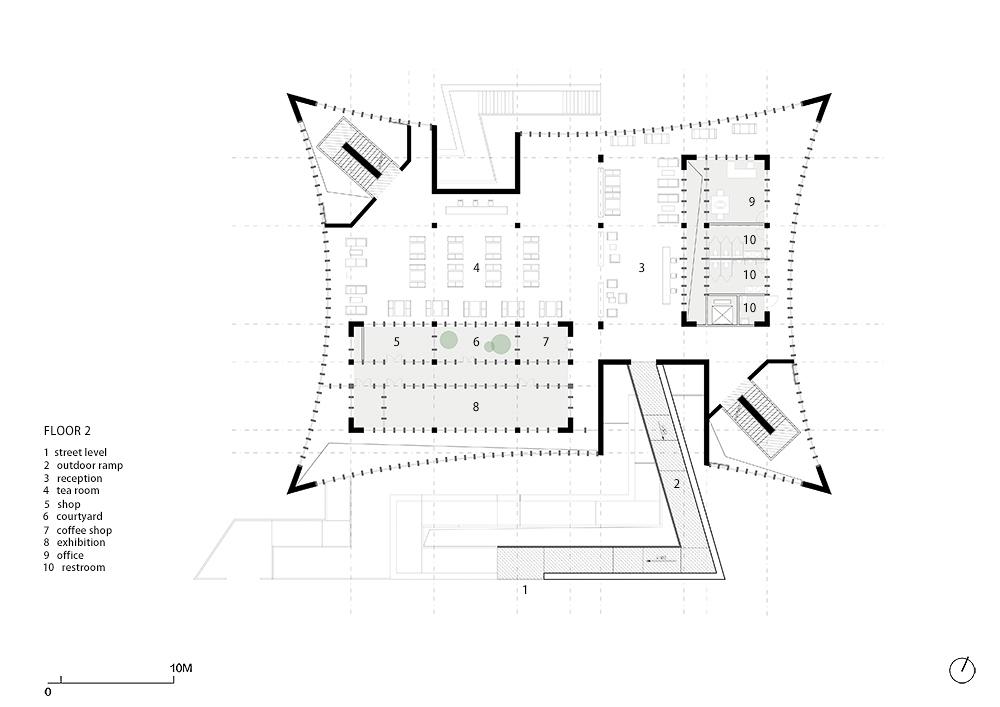 First of all the building mass resembles the traditional Yi sacrificial altar, where sacrifices refer to offers. The building, in its simple volume, is characterized by an iconic roof consisting of a concave arc. This architectural gesture aims to show a response to the tension of nature, and again refers to Yi sacrificial symbols. The roof establishes a dialogue with the sky through the skylight system and the concave shape works as a rain water collector. Via the gutter system the water vertically flows through the outdoor courtyards, creating a vertical connection of light and rain throughout the building, while solving the internal lighting and ventilation.